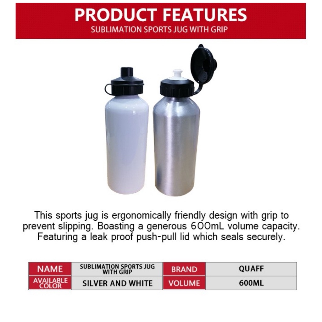 600ml QUAFF Sublimation Printable Sports Jug White / Silver