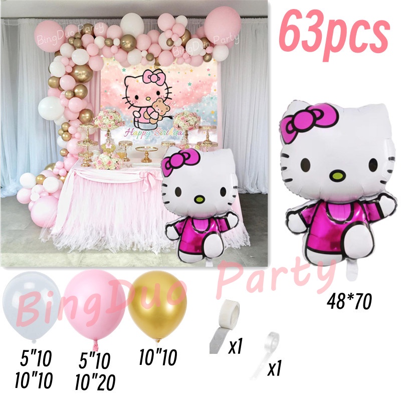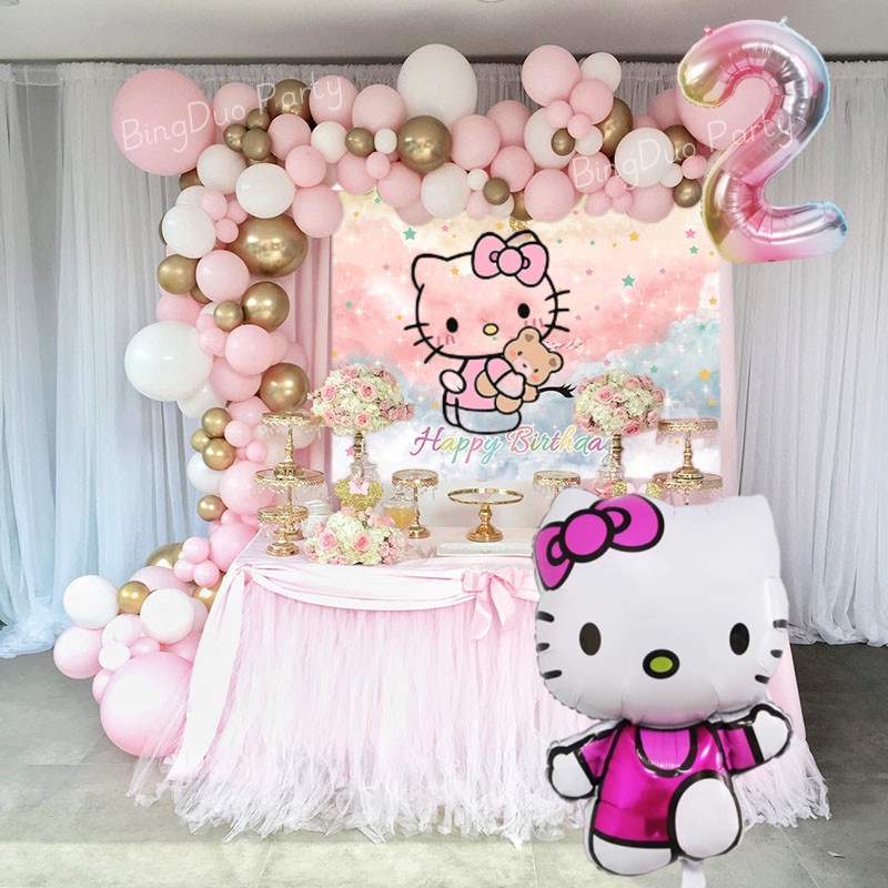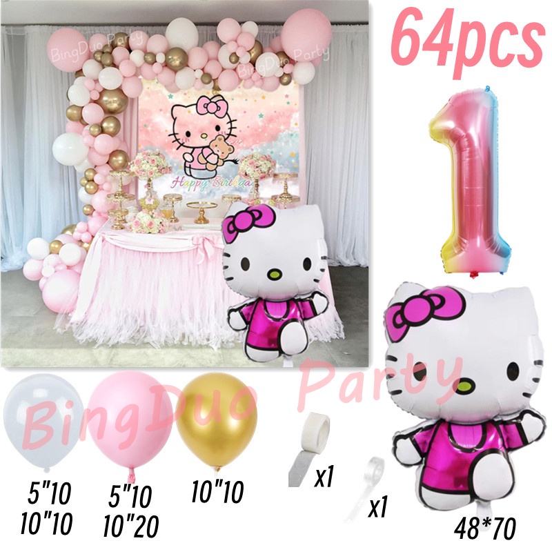 63/64pcs Set Disney Hello Kitty Theme Balloons Garland Arch Kit 32"Gradient Number Standing Hello Kitty Party Decorations