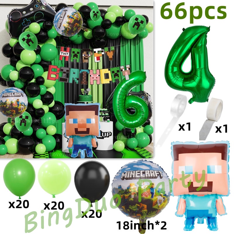 65/66pcs Minecraft Theme Balloons Garland Arch Kit Steven Foil Balloon 32"Green Number Green Black Balloon Party Needs