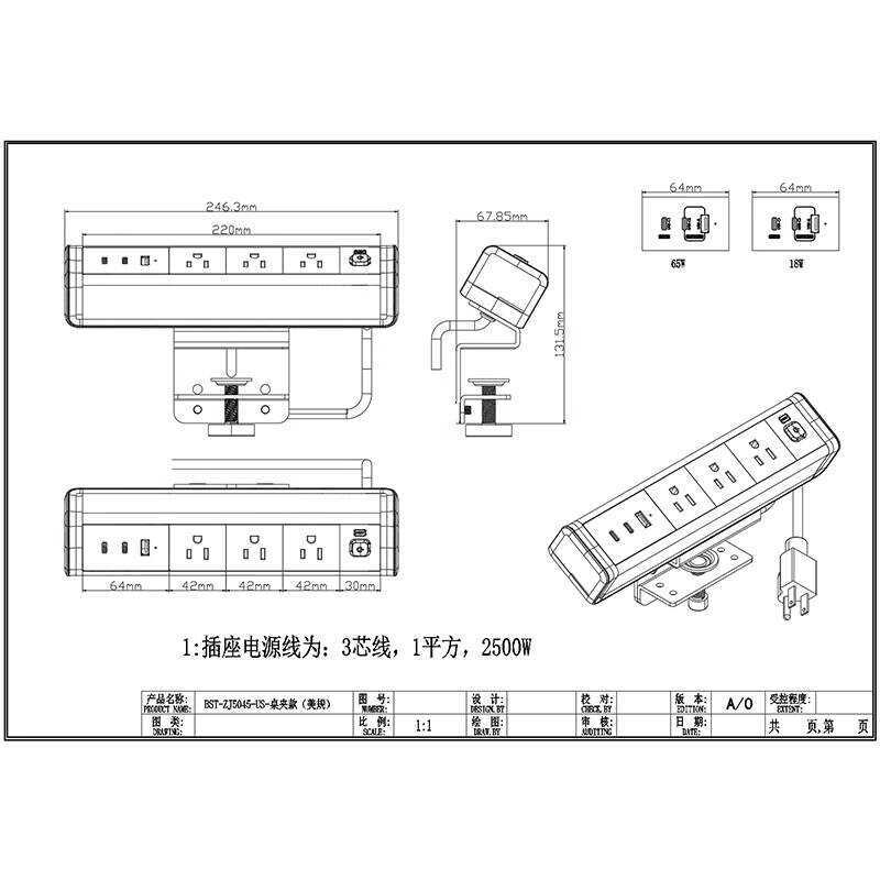 65W Socket High USB Multi-Function Strip US Standard 3 Power Twist Fixed Office Desk Clip Plug