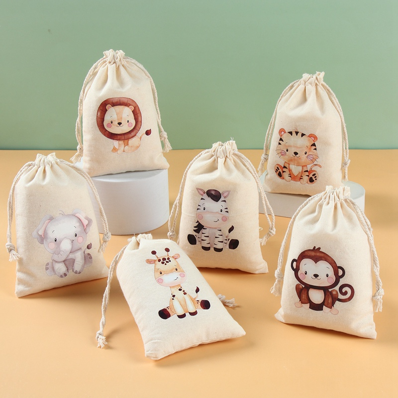 6PCS Cotton Fabric Safari Theme Loot Bag For Birthday Candies For Lootbags Mini Loot Bags Jungle Animal Drawstring Bag Birthday Souvenir Giveaway Gift Bag Kids Birthday Party Needs