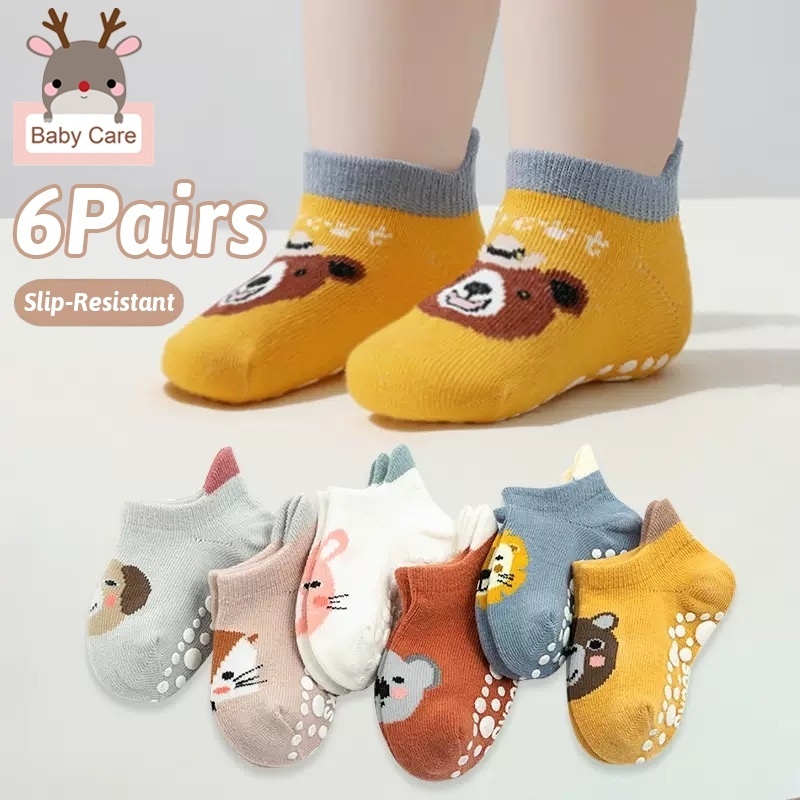 6Pairs Kids Cartoon Animal Socks - Slip-Resistant with Fun Dot Glue Patterns - Soft & Cozy Floor Soc