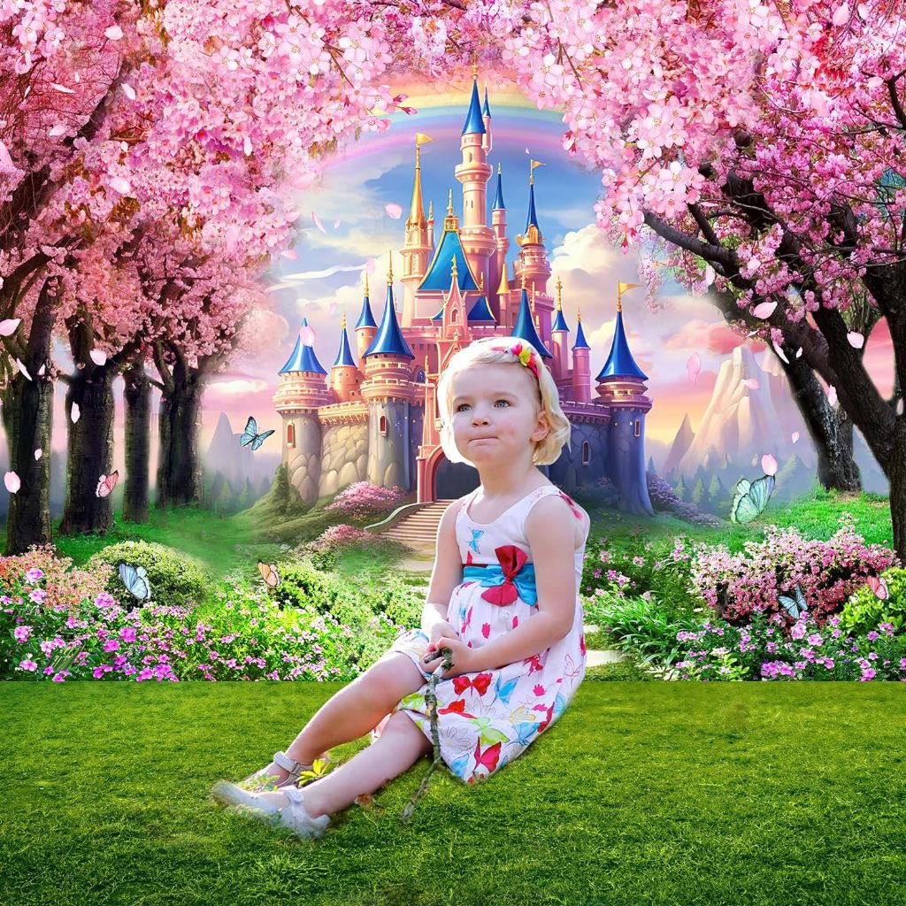 7Wx5H ft Princess Castle Backdrop Polyester Fabric Pink Sakura Rainbow Flowers Floral Fantasy Fairy Tale Wonderland Photography Background Birthday Wedding Party banner Photo Stud