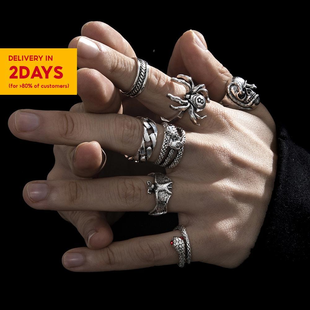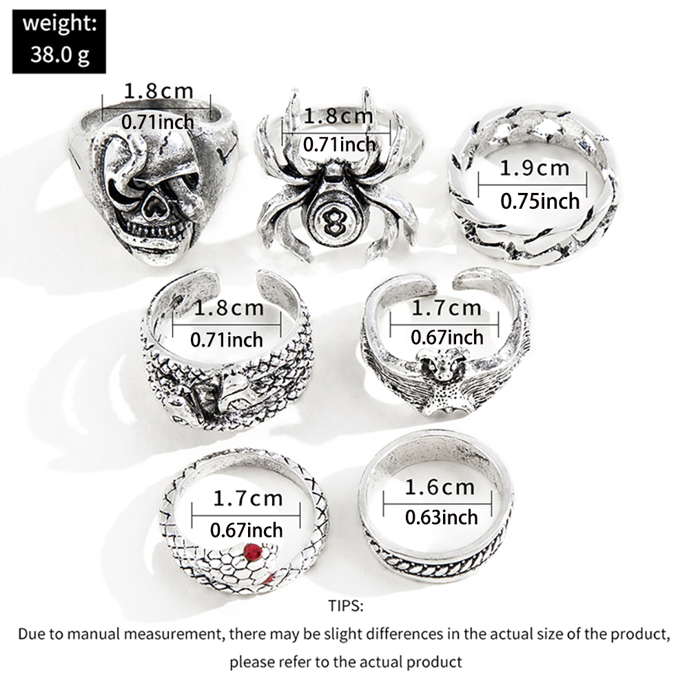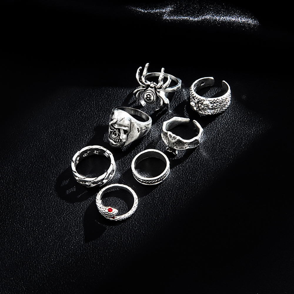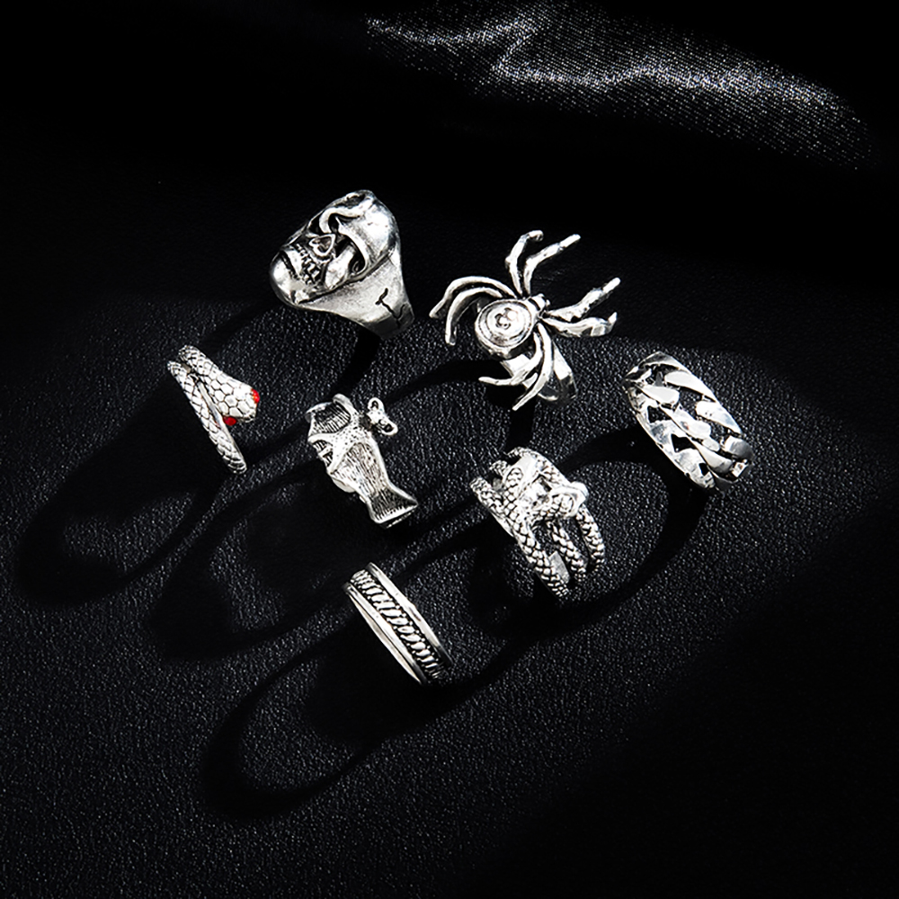7pcs New Style Retro Hip-Hop Dark Style Skull Spider 8-Character Ring Creative Unique Metal Snake Ring Set, For Christmas Gift