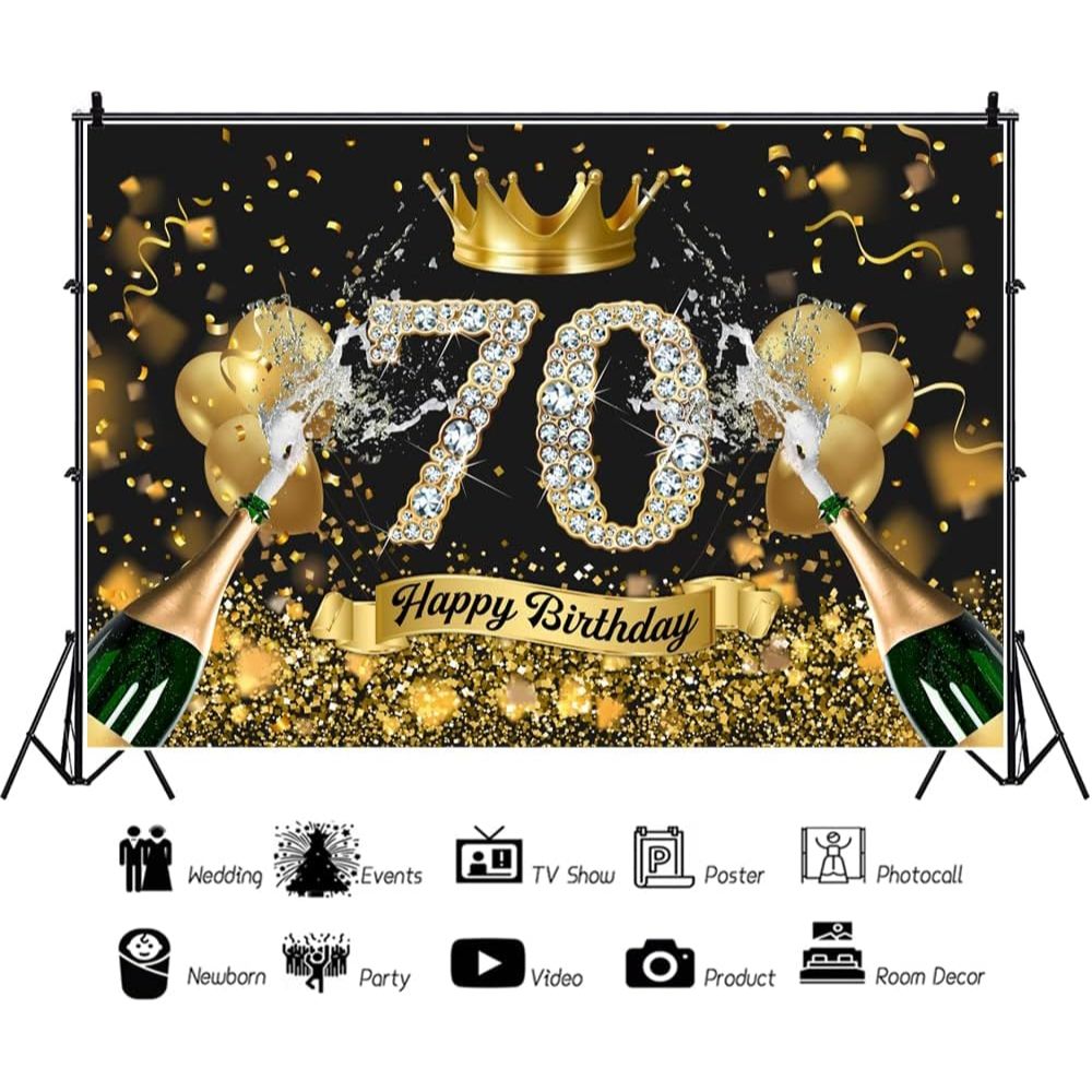 7x5ft Happy 70th Birthday Photography Backdrop for Grandpa Grandma Black Gold Celebration Dinner Background Bokeh Crown Balloon Gold Ribbon Brilliant Diamond Sequins Decor Banner