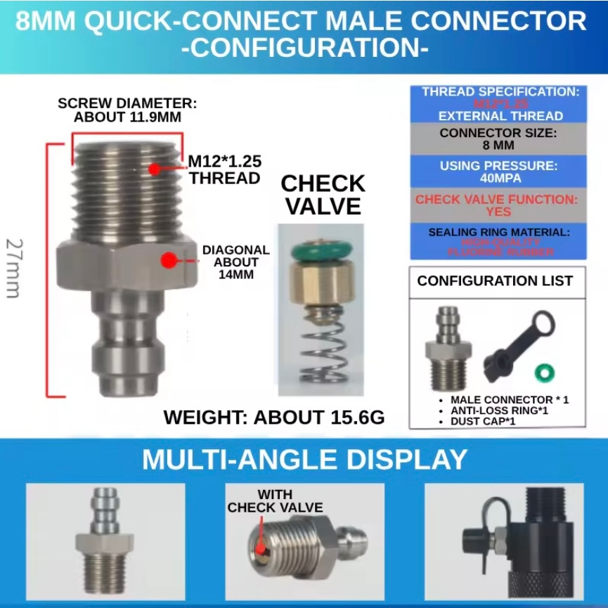 8mm Quick Connect Check Valve Male Thread Connector M12*1.25 gas cylinder container inlet nozzle