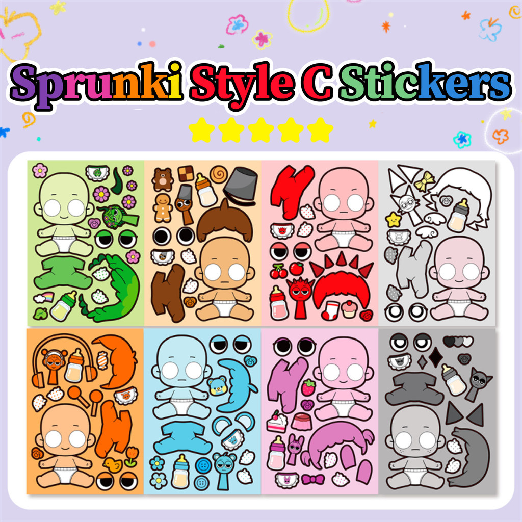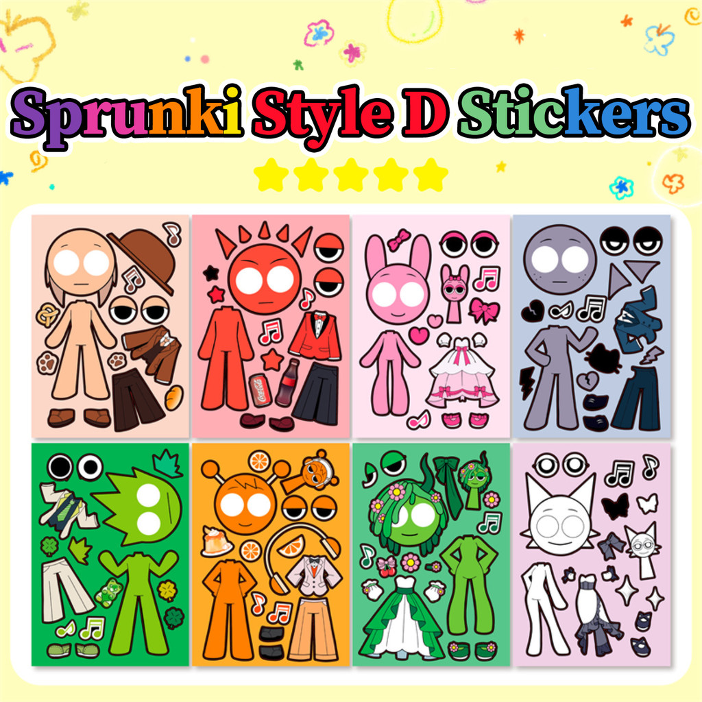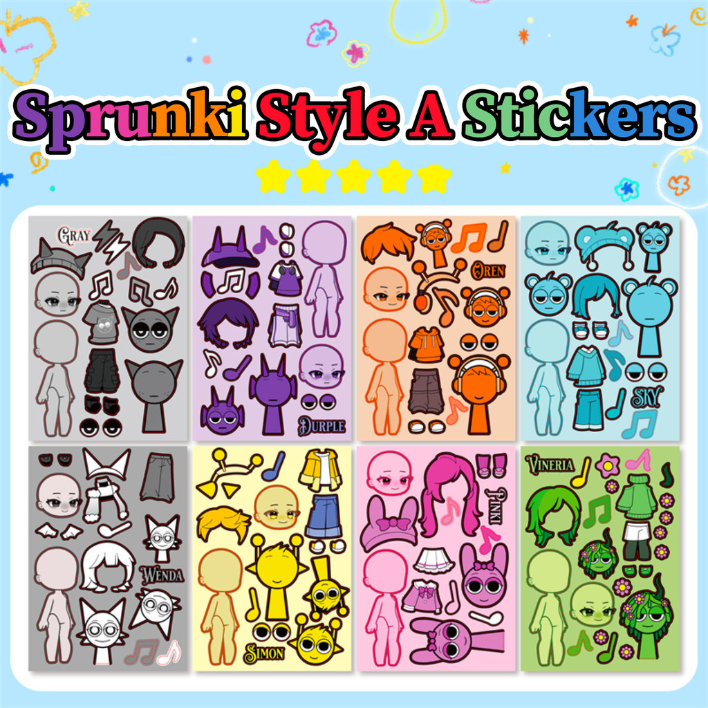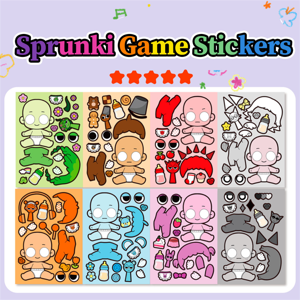 8sheets/set Sprunki Game Stickers Human Version Baby Dress up Stickers Character Dress up Puzzle Stickers