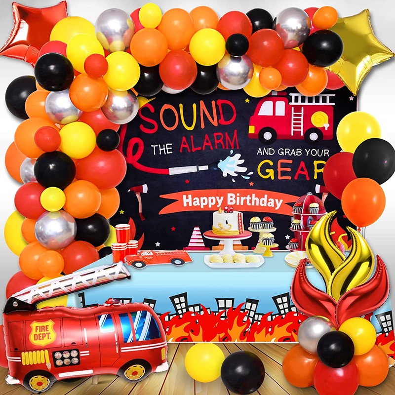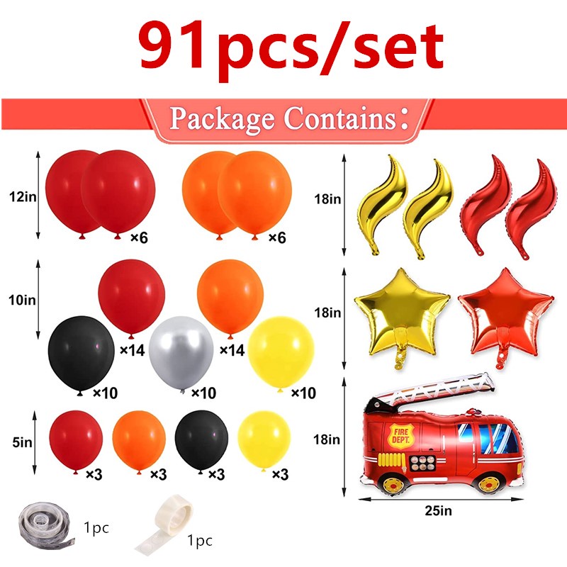 91pcs Kid Firefighter Birthday Party Balloon Garland Arch Kit Fire Truck Party Red Balck Yellow Balloon Banner
