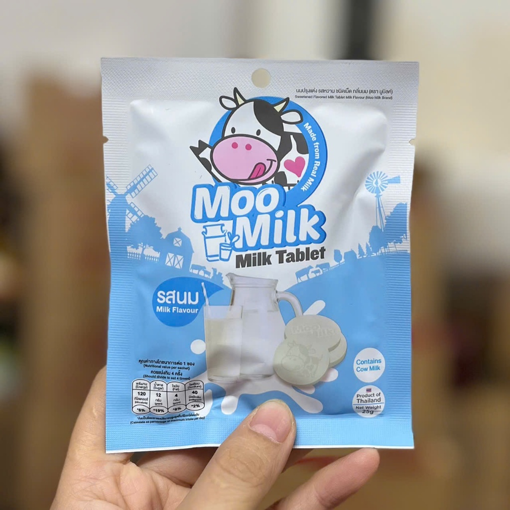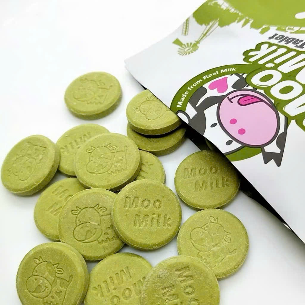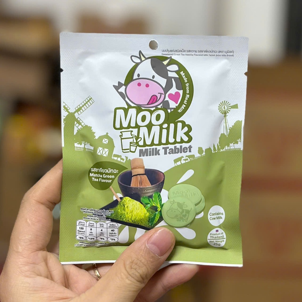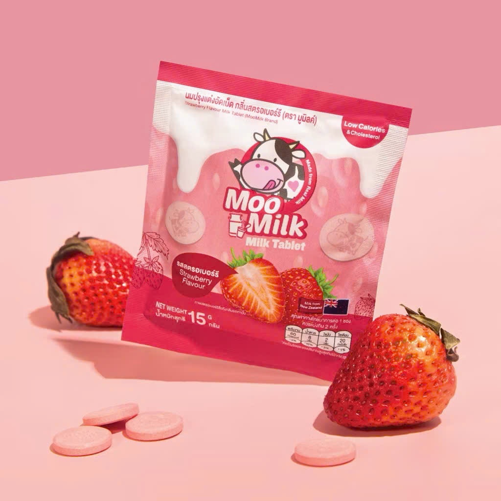 A pack of Moo Milk Thai cow's Milk candy 25g with 4 flavors of Milk, strawberry, matcha, chocolate
