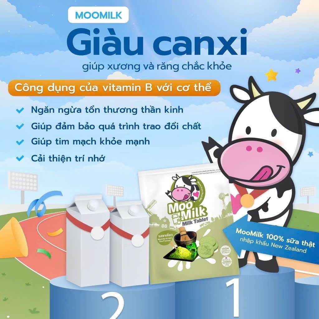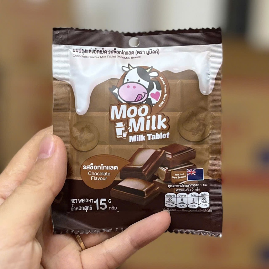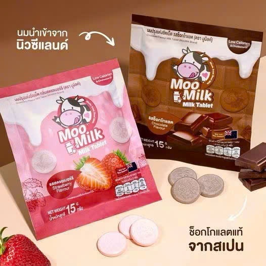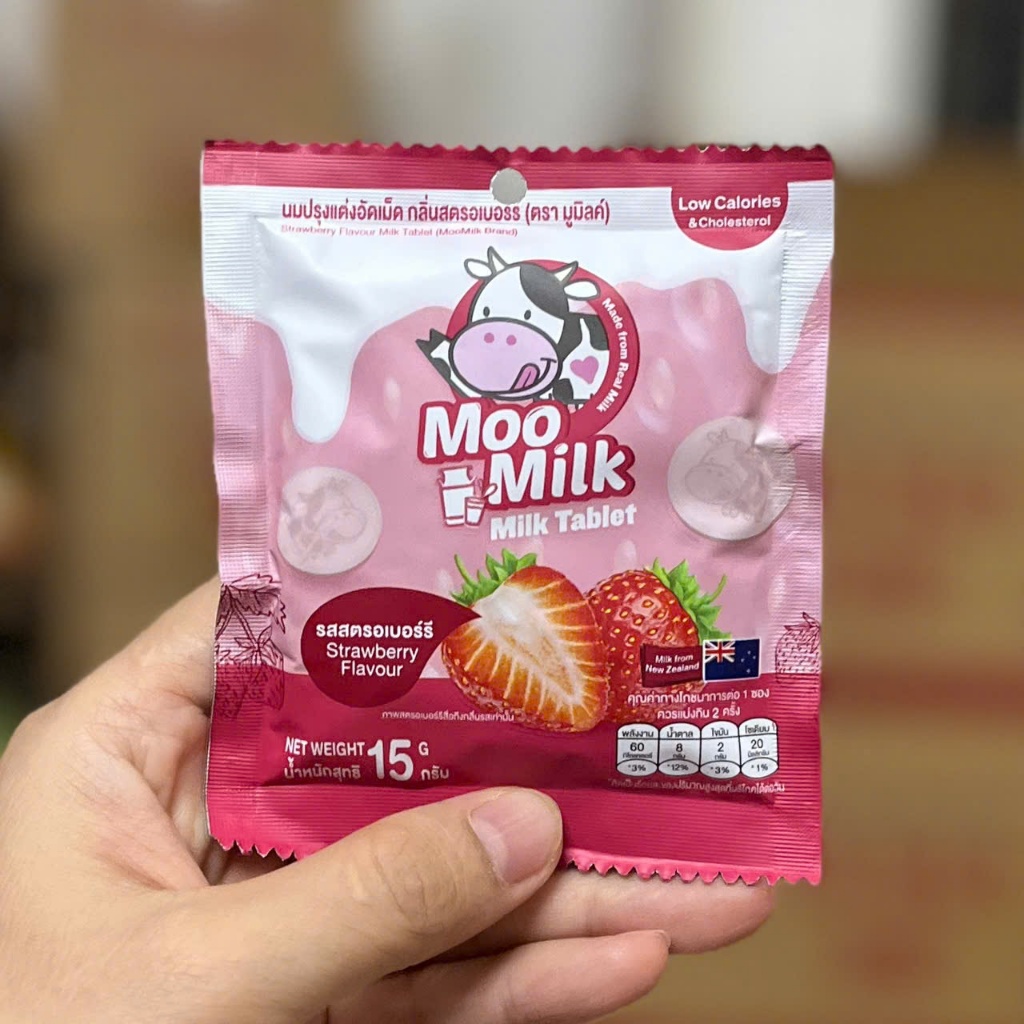 A pack of Moo Milk Thai cow's Milk candy 25g with 4 flavors of Milk, strawberry, matcha, chocolate