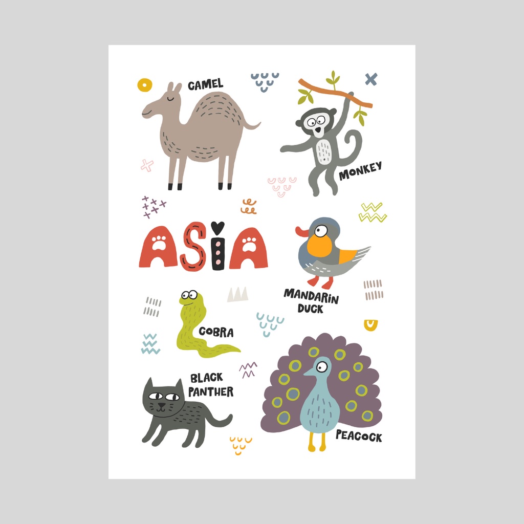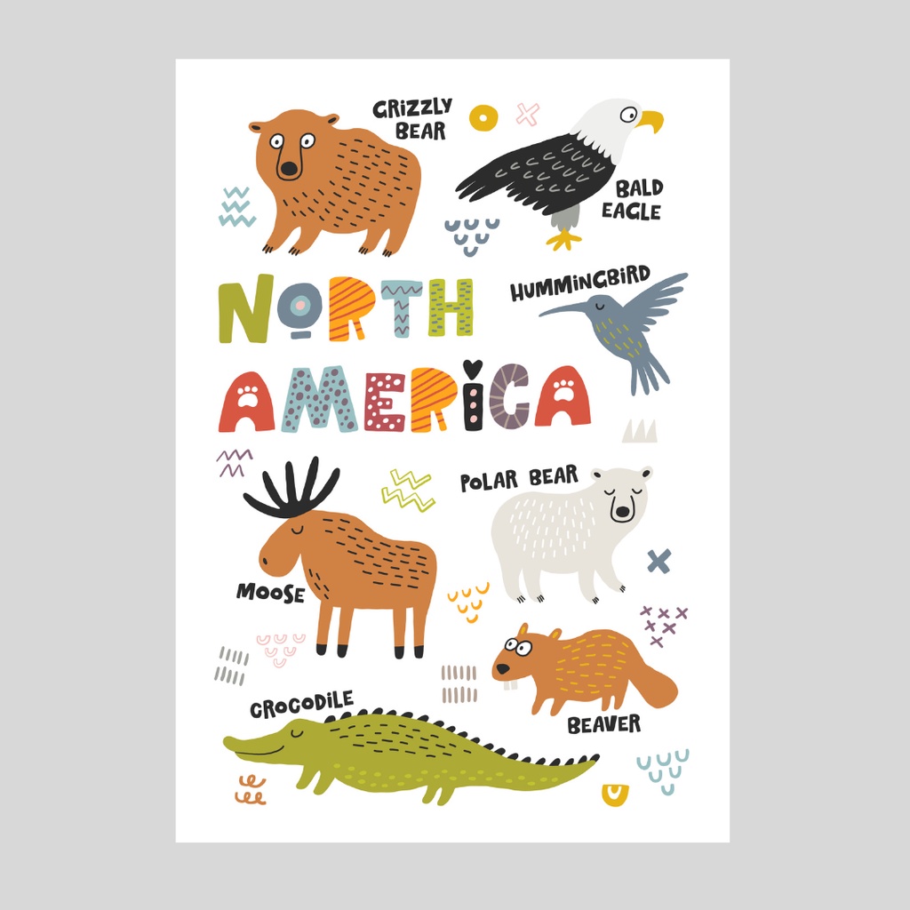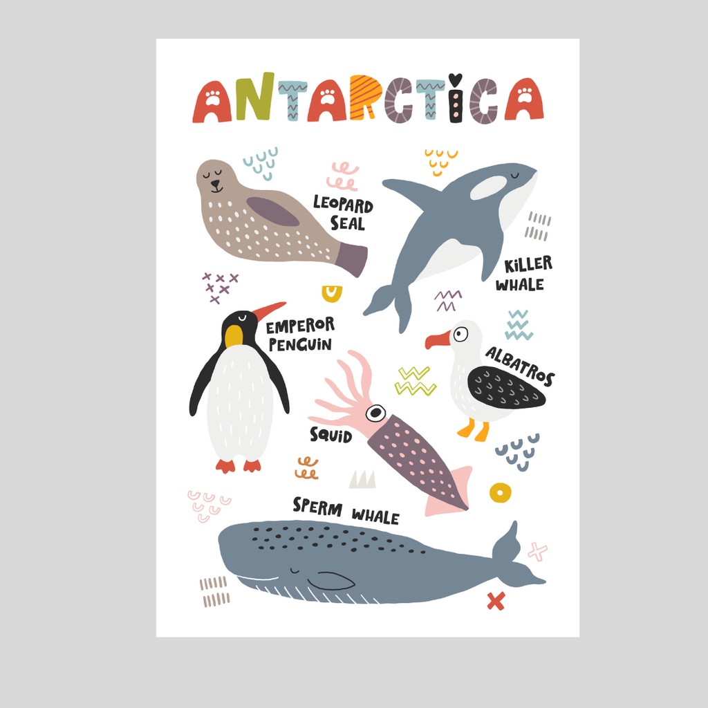 A4 A3 Cute Animals of Seven Continents, Educational Chart Poster for kids toddler, Wall Art Nursery
