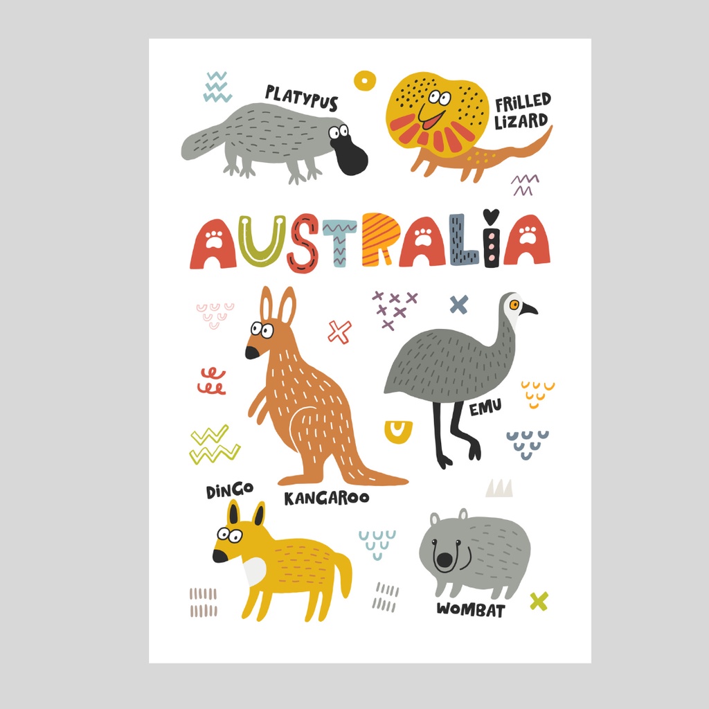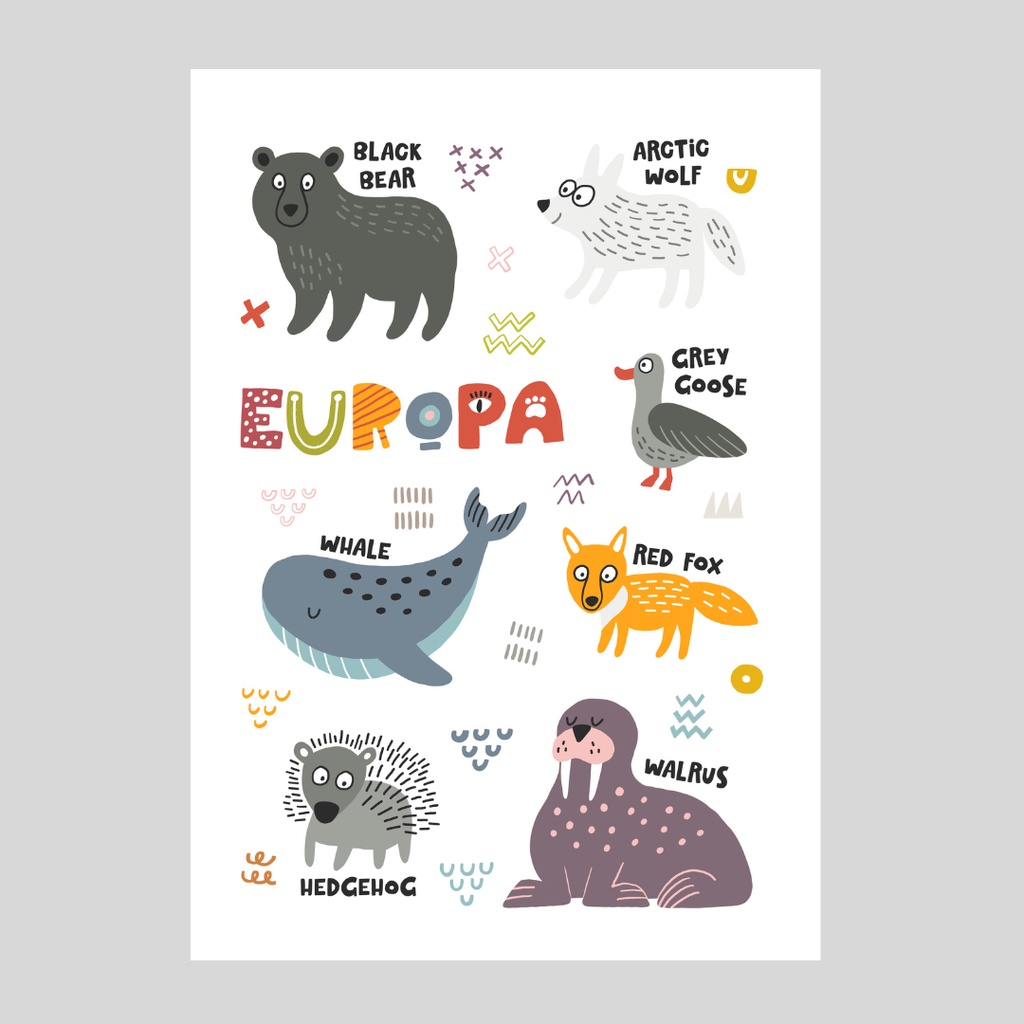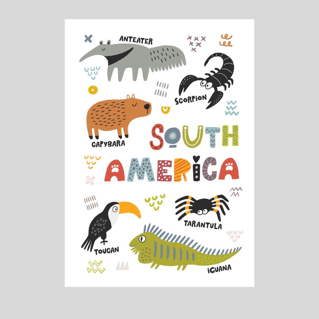 A4 A3 Cute Animals of Seven Continents, Educational Chart Poster for kids toddler, Wall Art Nursery