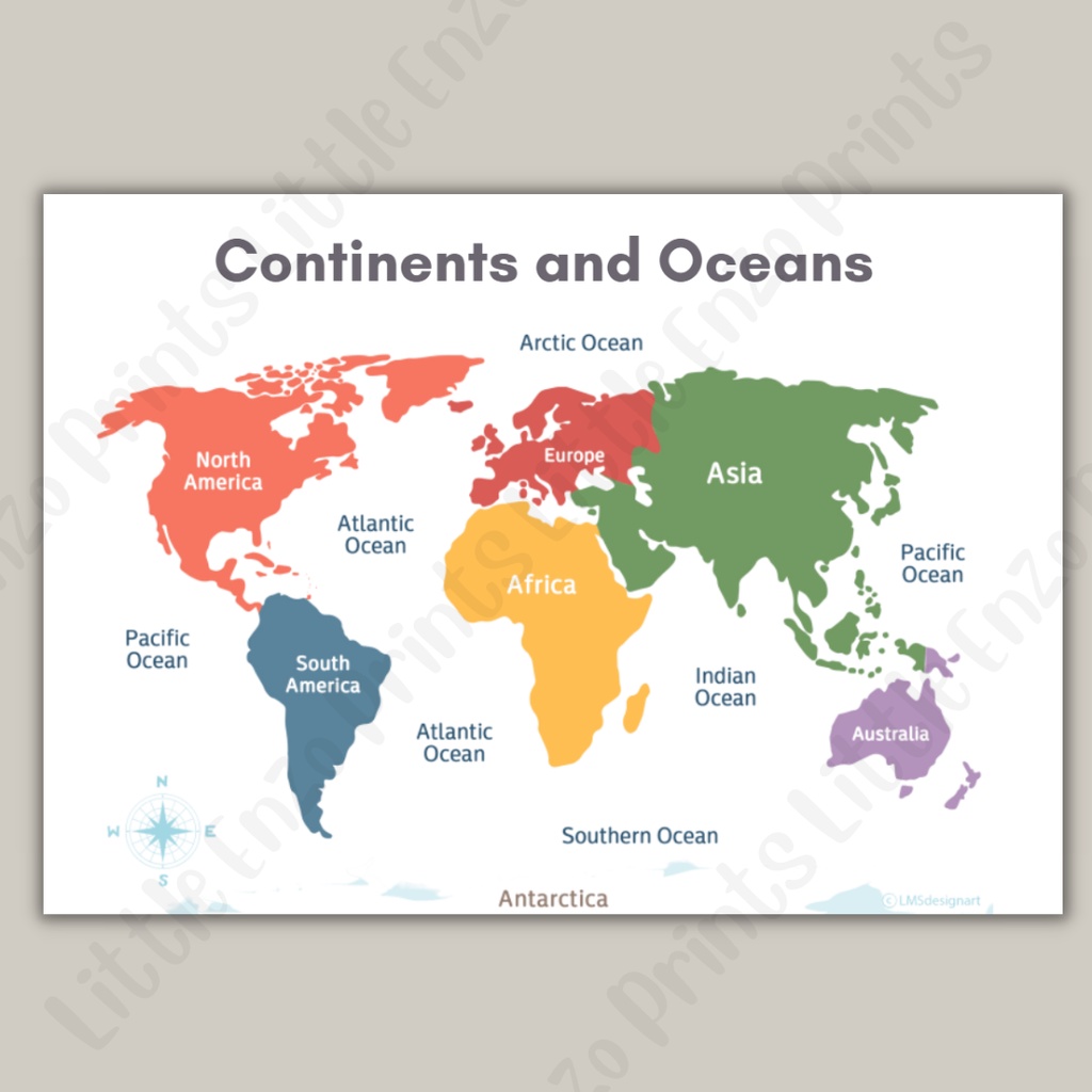 A4 Continents and Oceans Educational Chart Poster, Homeschool Learning Materials for Kids Preschool