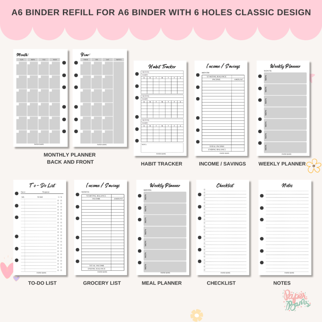 A6 Binder Refill for 6 holes binder A6 Loose Leaf Refill Classic Plain Design | Bambi Creates