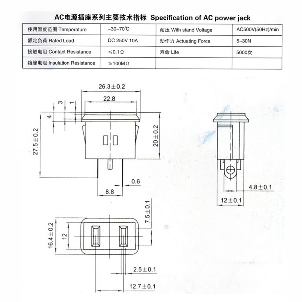AC-02A 2 PIN US Plug Panel Mount US Outlet Power Socket Male Power Cord Inlet AC Power Socket Receptacle Connector 15A 125V