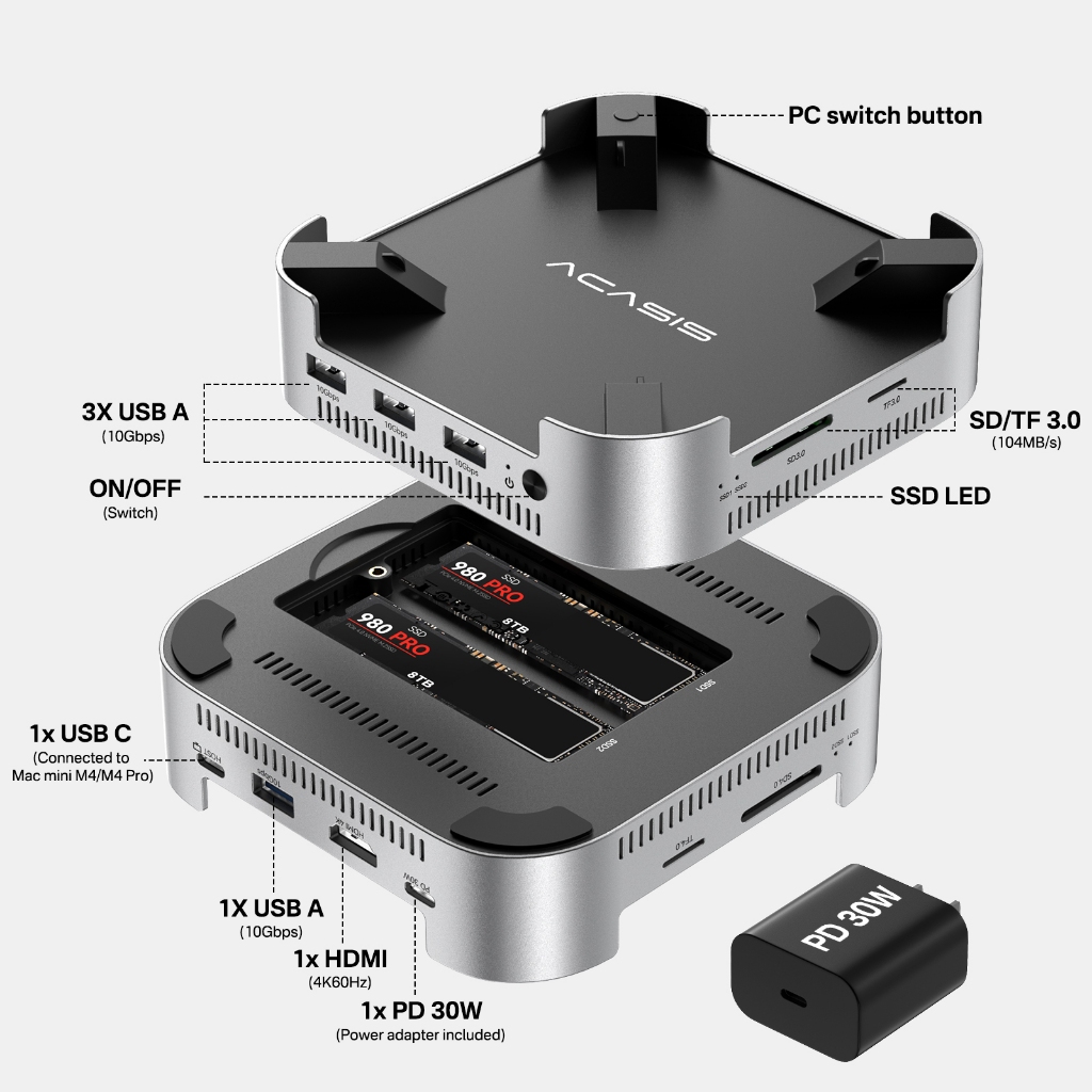 ACASIS 10Gpbs MINI Enclosure Docking StationCompatible with Thunderbolt 4/3 USB-C with HDMI, SD/TF 3.0, 4xUSB-A 3.1, 2xM.2 & 30W PD Charging For Mac mini/Laptop docking station
