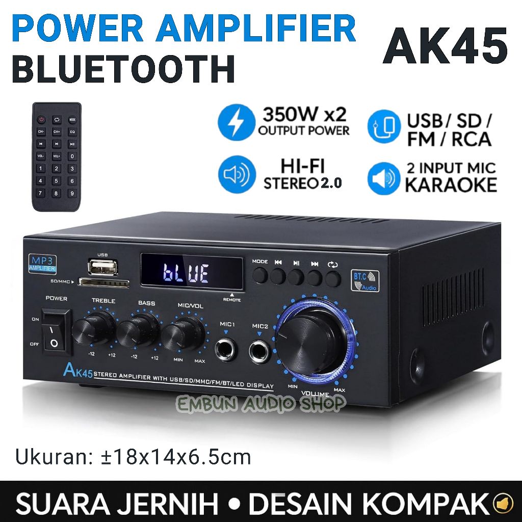 AK45 Hi-Fi Stereo Bluetooth Power Amplifier 350W x 2 Mini Audio Receiver Amplifier 2 Channel Bluetooth 5.0 Digital Amplifier Hi-Fi Stereo Power Amplifier with USB, SD, FM, RCA for Home