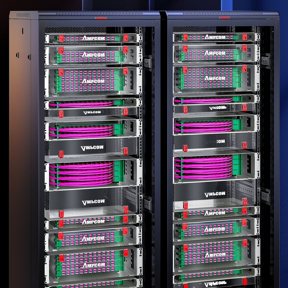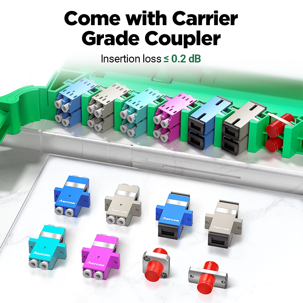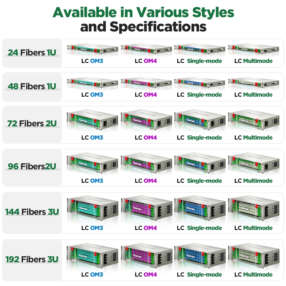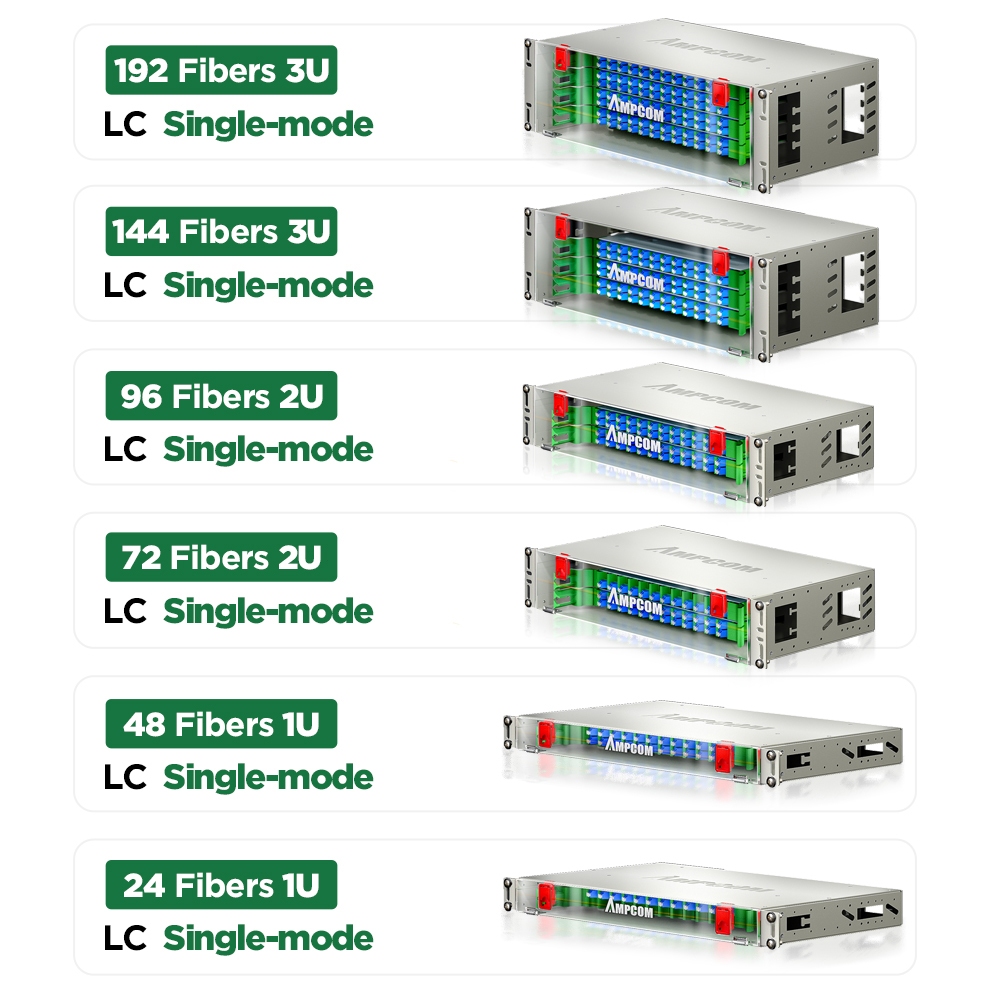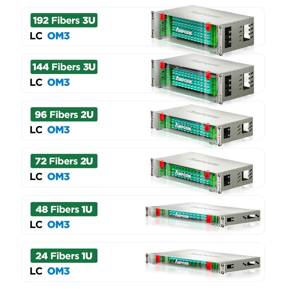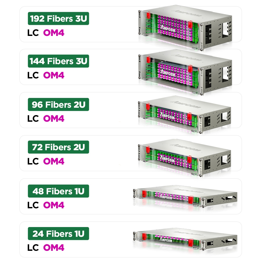 AMPCOM 24 to 192 Core OM3 OM4 LC Rack Mount Visual Fiber Optic ODF Enclosure Optic Patch Panel Transparent Visual Front Cover Termination Box
