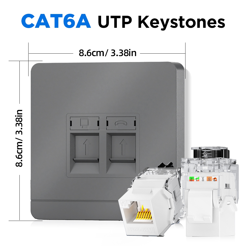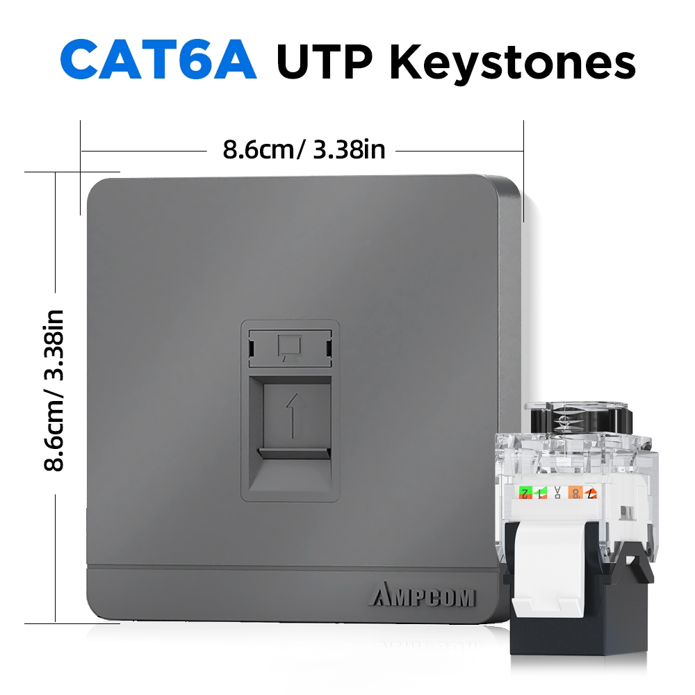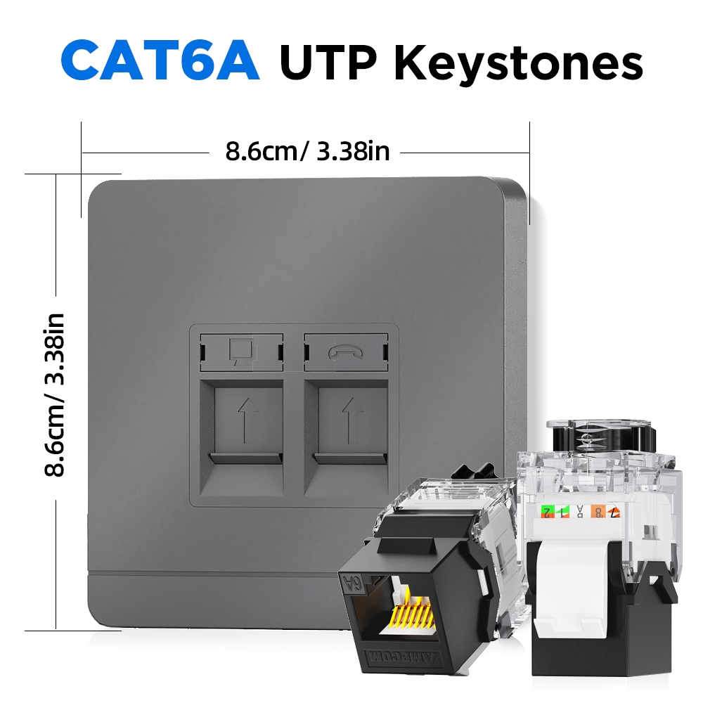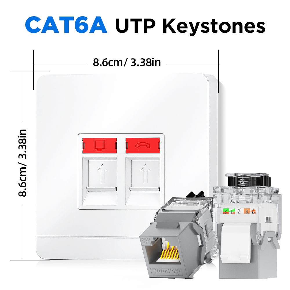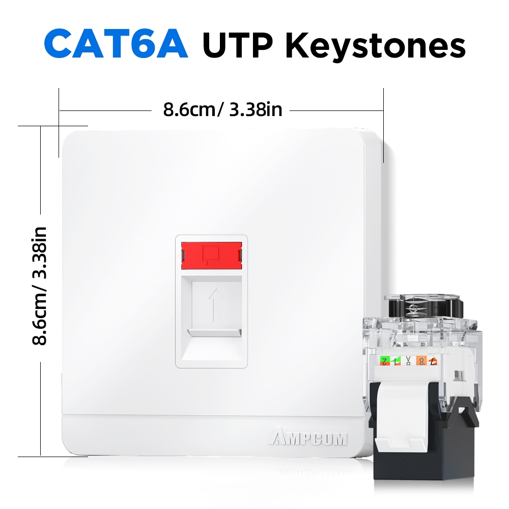 AMPCOM 86*86 Wall plate with CAT6A Keystone Jack Kit, Wall Faceplate With CAT6A 10Gbps UTP Ratchat Keystone Jack Tool Free, RJ45 Self-Locking Module With 86mm faceplate