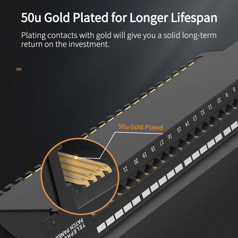 AMPCOM Telephone Patch Panel, 19 Inch Rack 50U Gold-Plated Voice Patch Panels RJ11 RJ45 8P4C 6P4C, RJ11 1U CAT3 25/50 Ports