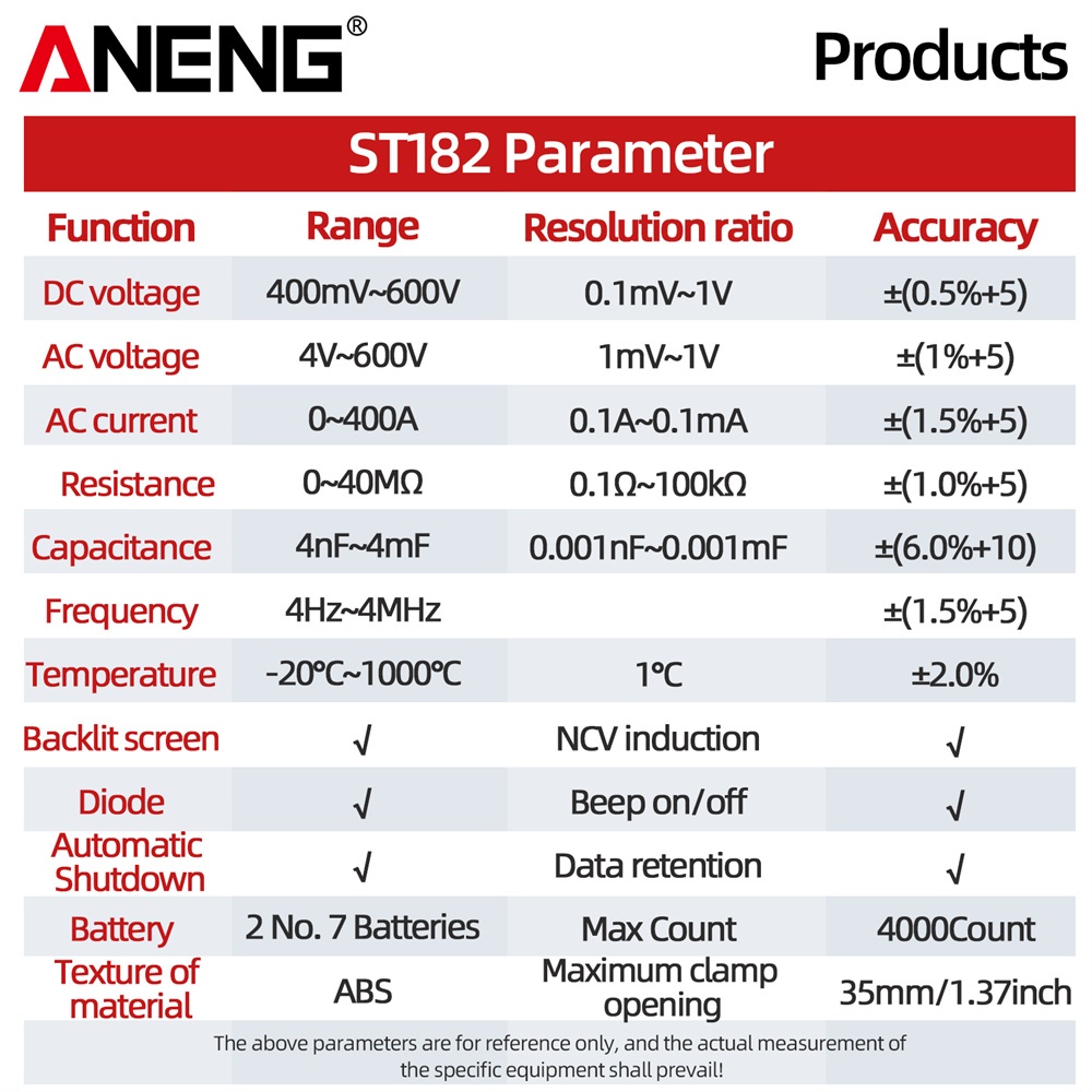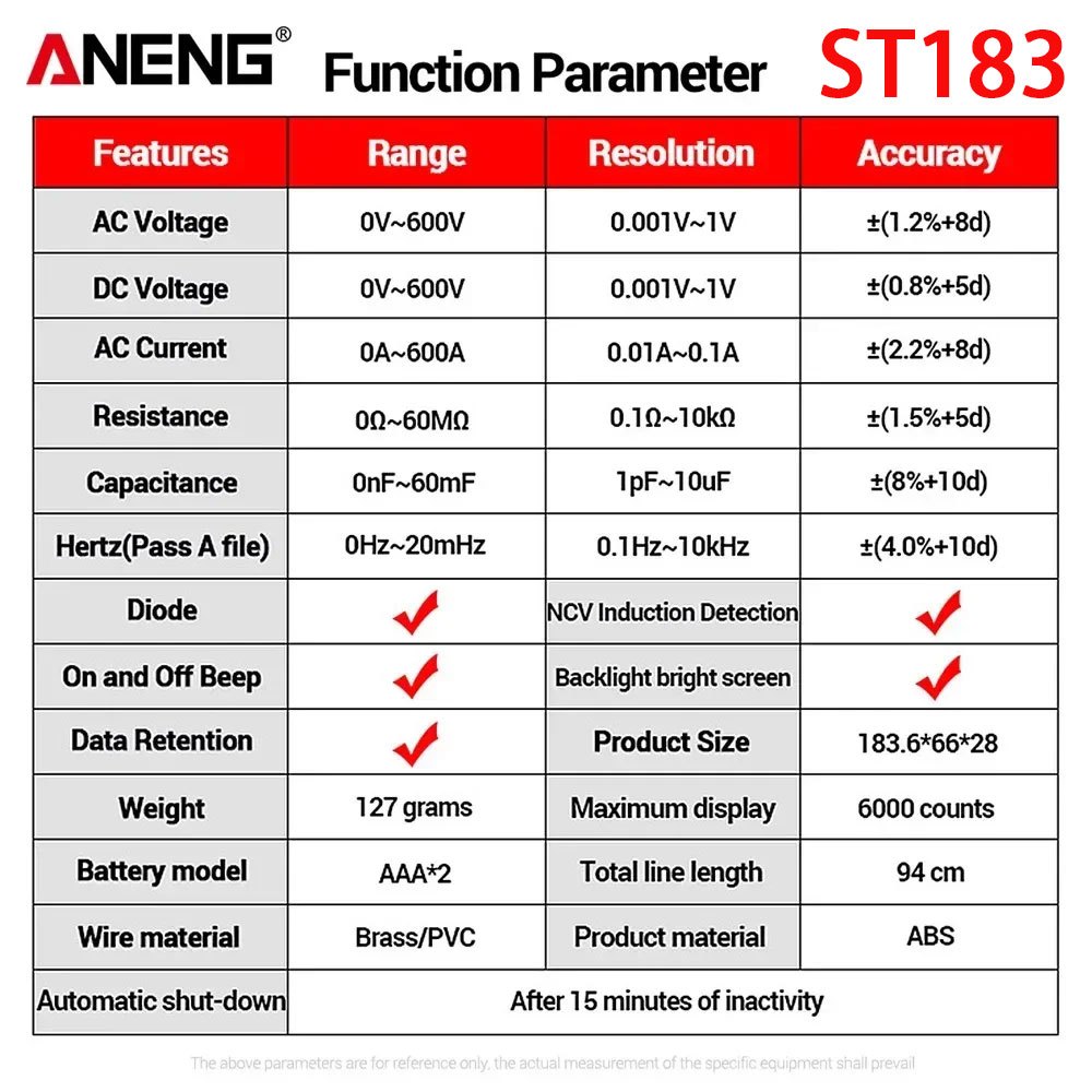 ANENG ST181/ST182/ST183 Digital clamp meter DC/AC voltage Ammeter Voltage tester Ampere-Hertz capacitance NCV Ohm test data retention automatically turned off