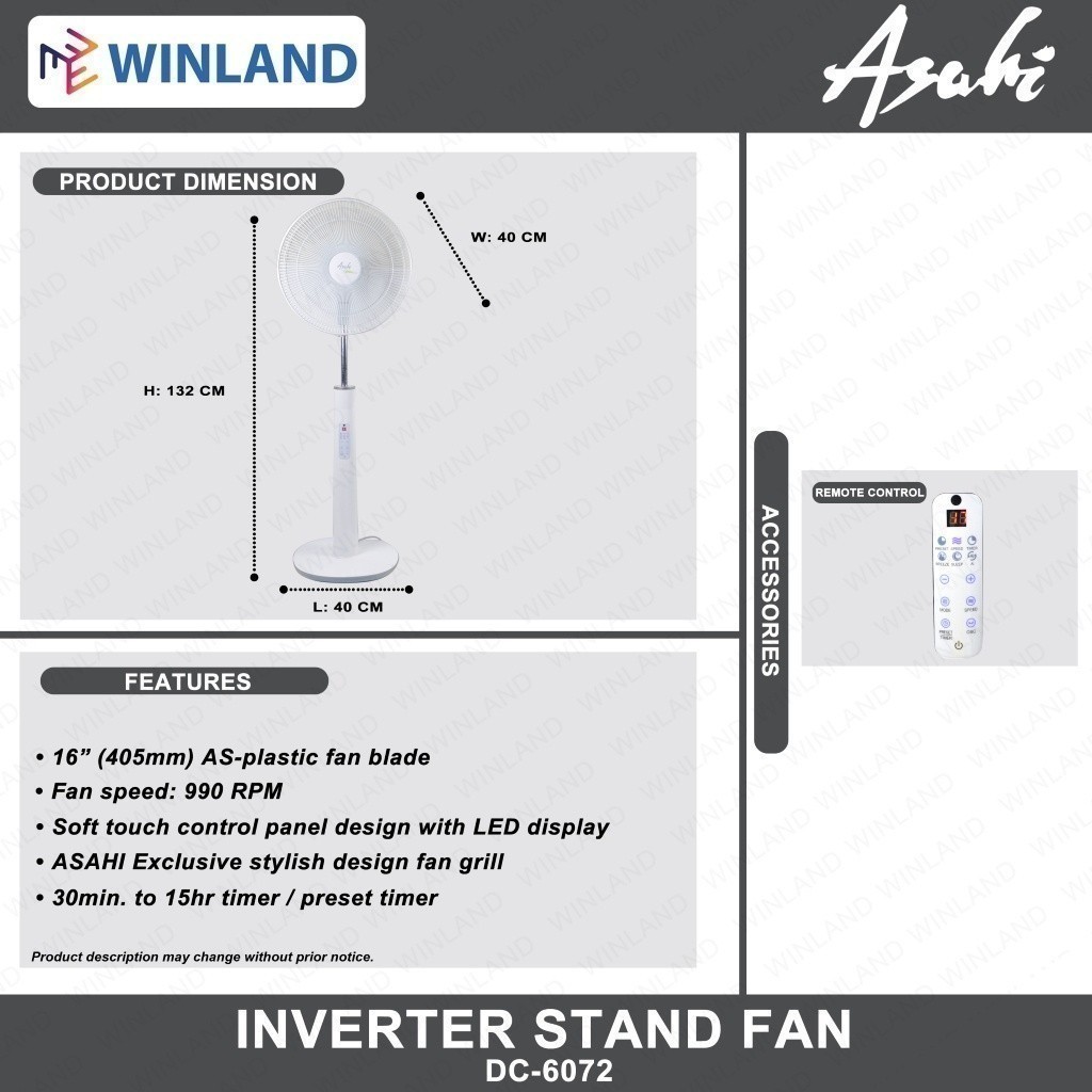 Asahi by Winland Inverter Stand Fan with 24 Speeds Control and LED Display DC-6072