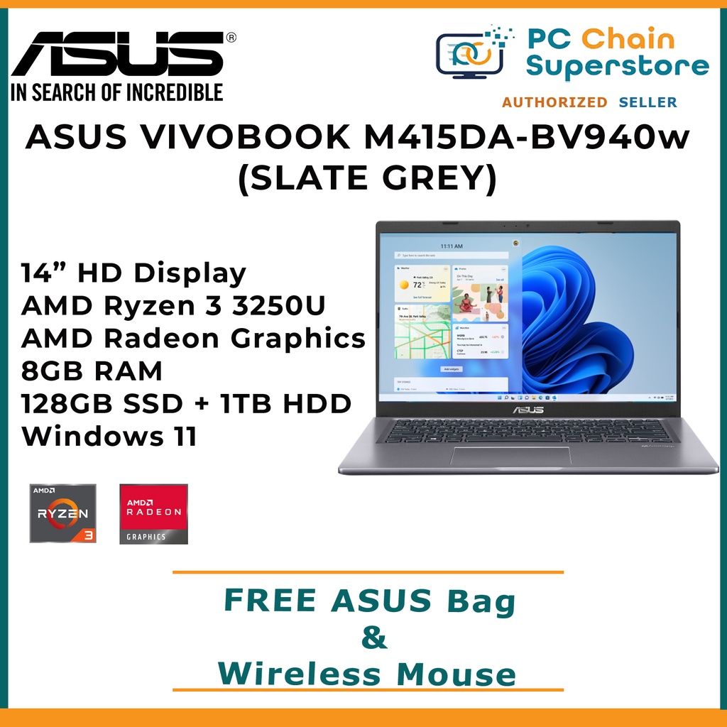 ASUS VIVOBOOK M415DA-BV940W Slate Grey Laptop - 14" HD | AMD Ryzen 3 3250U | 8GB RAM | 1TB HDD+128GB