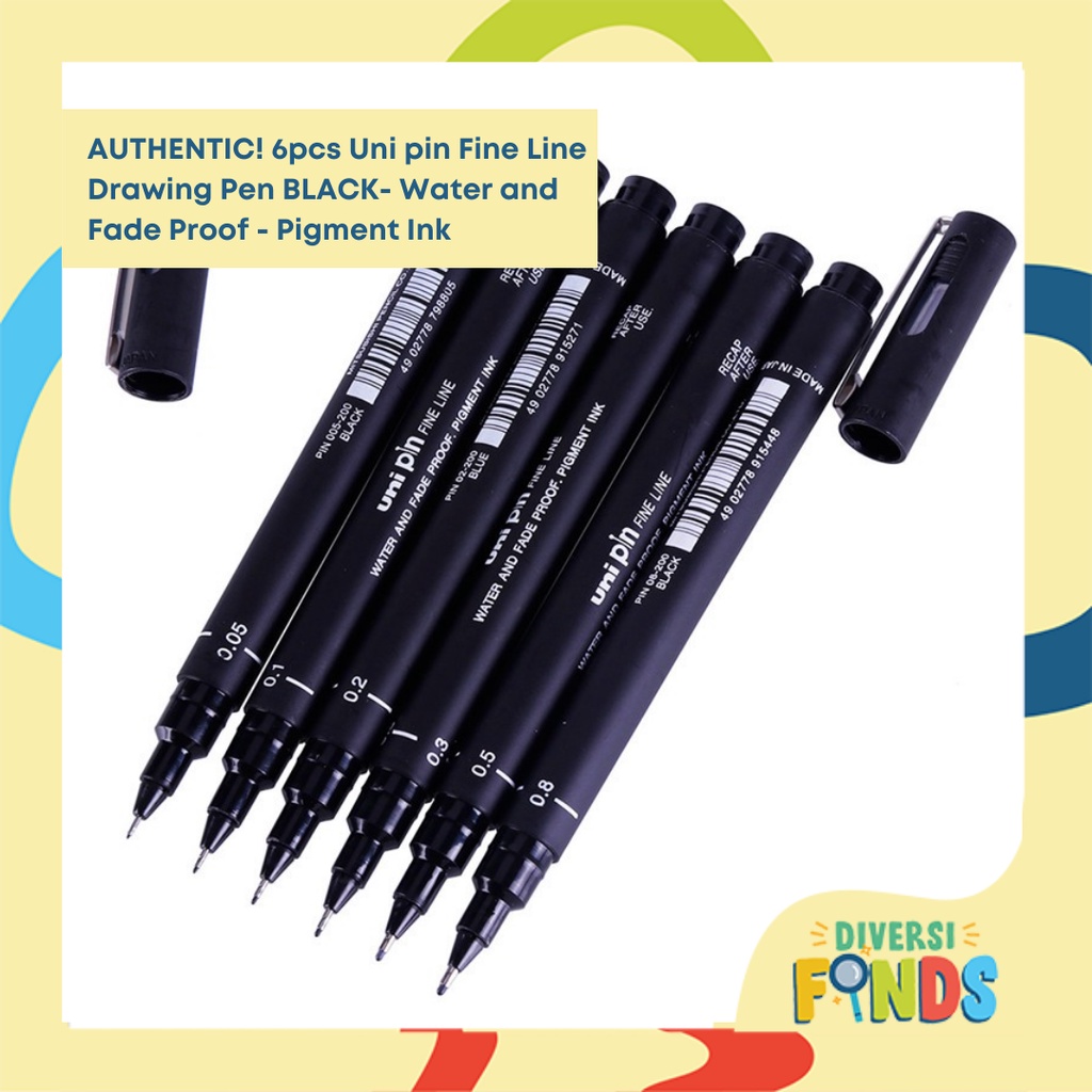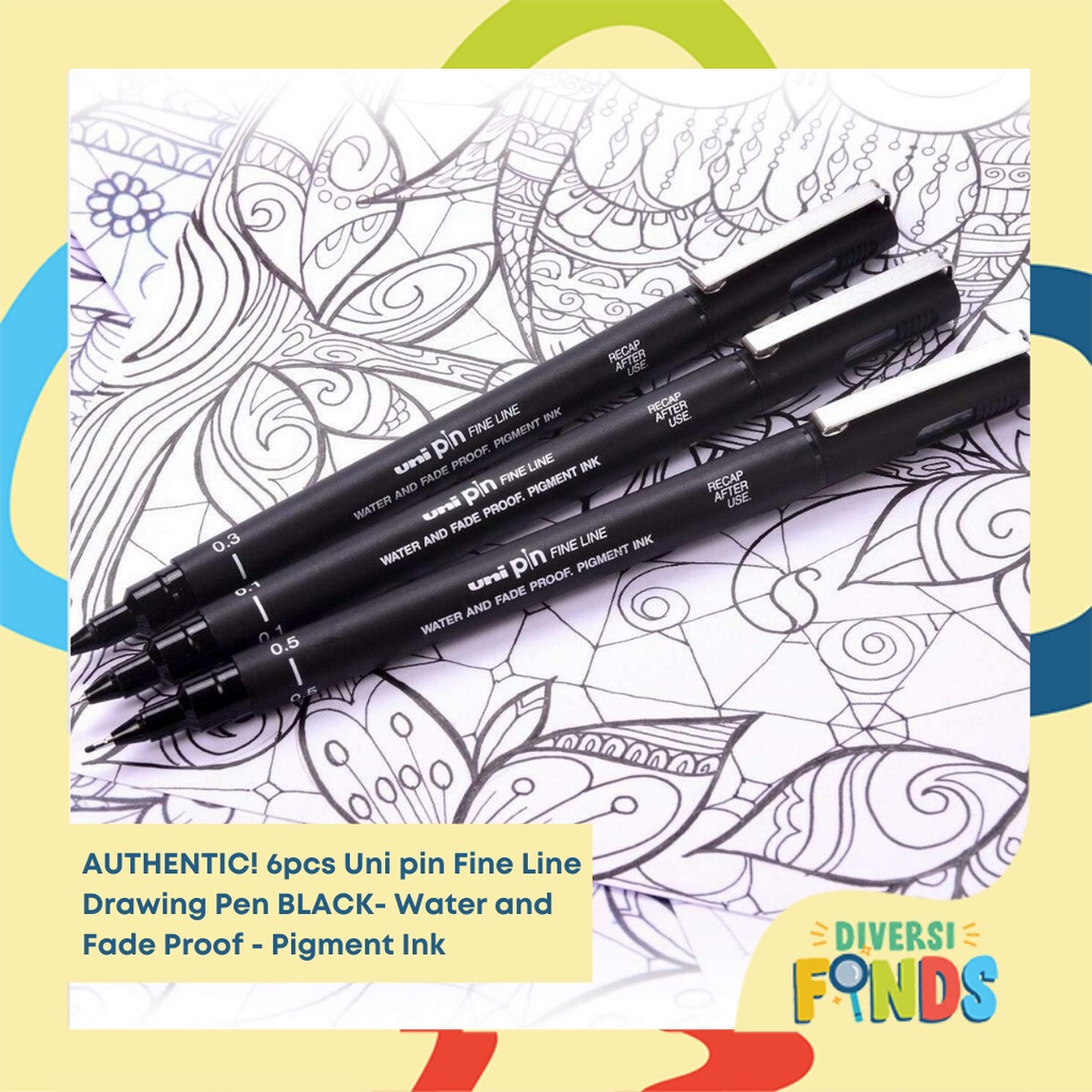 AUTHENTIC! 6pcs Uni pin Fine Line Drawing Pen BLACK- Water and Fade Proof - Pigment Ink