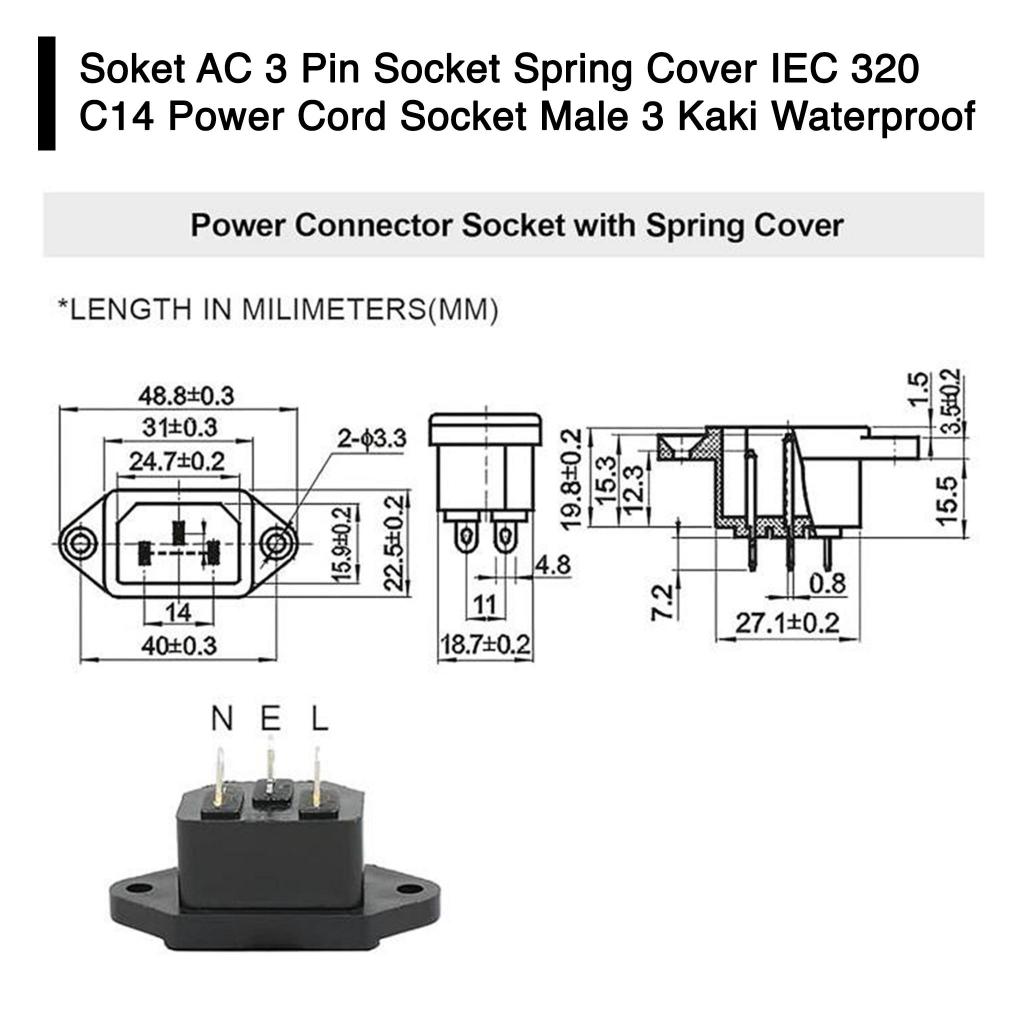 3 Pin AC Socket Spring Cover Anti-Dust Water Splash Socket Spring Cover IEC 320 C14 Power Cord Socket Male 3 Feet Waterproof