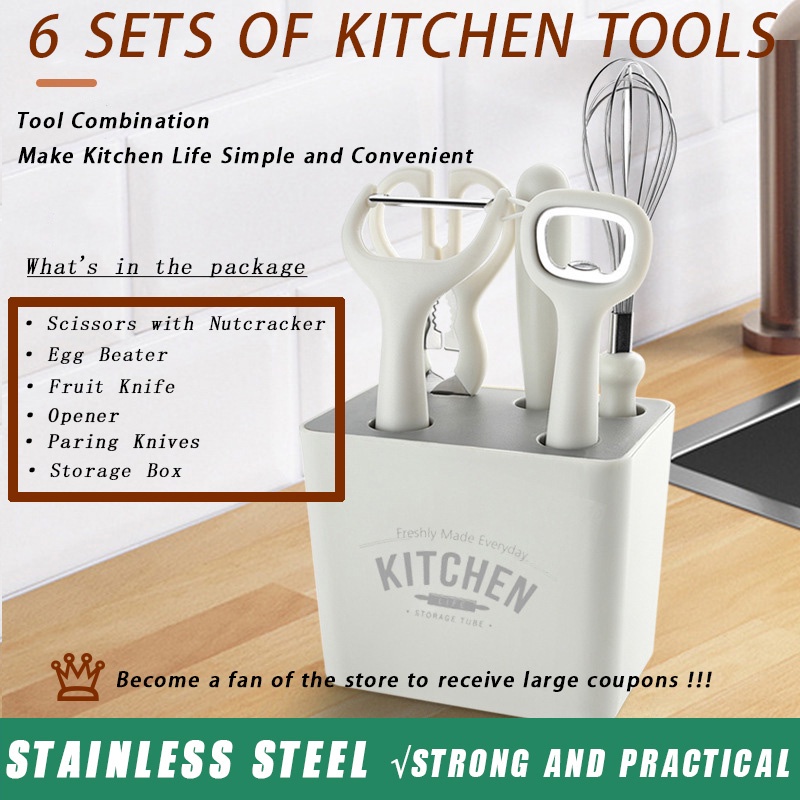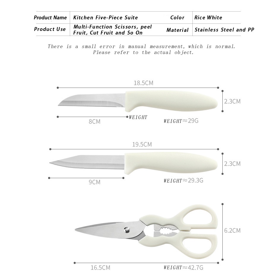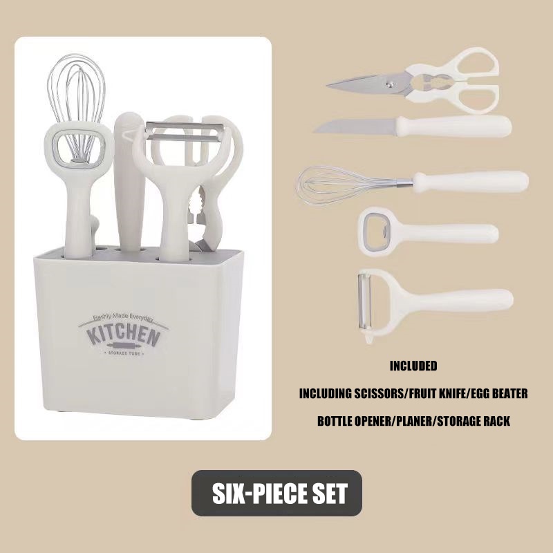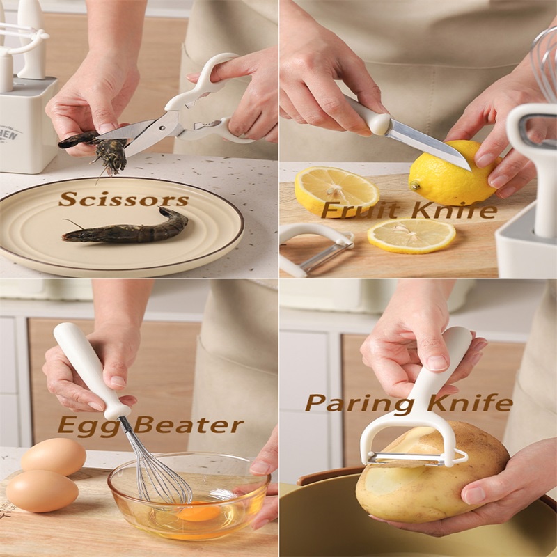 Aesthetic 5 in 1 white kitchen utensil set (bottle opener, peeler, knife, scissors, beater) tool set