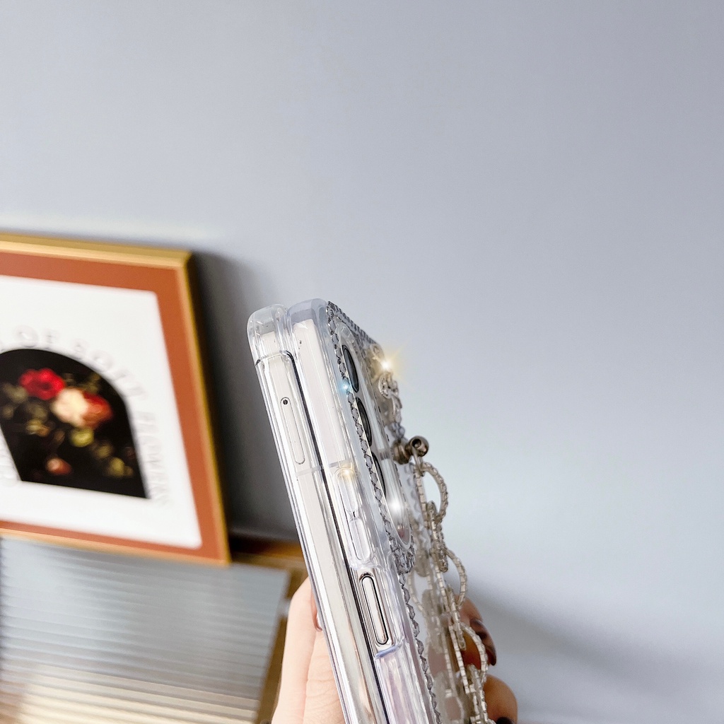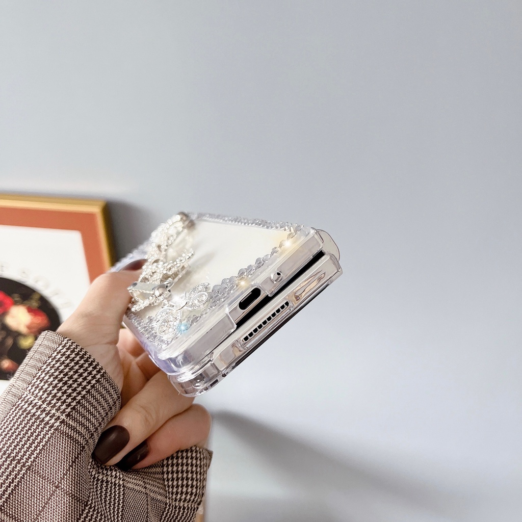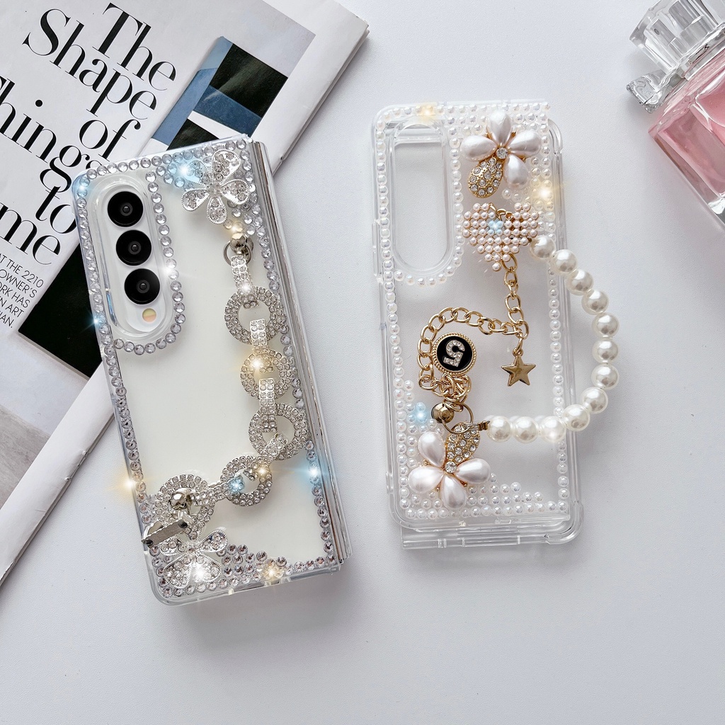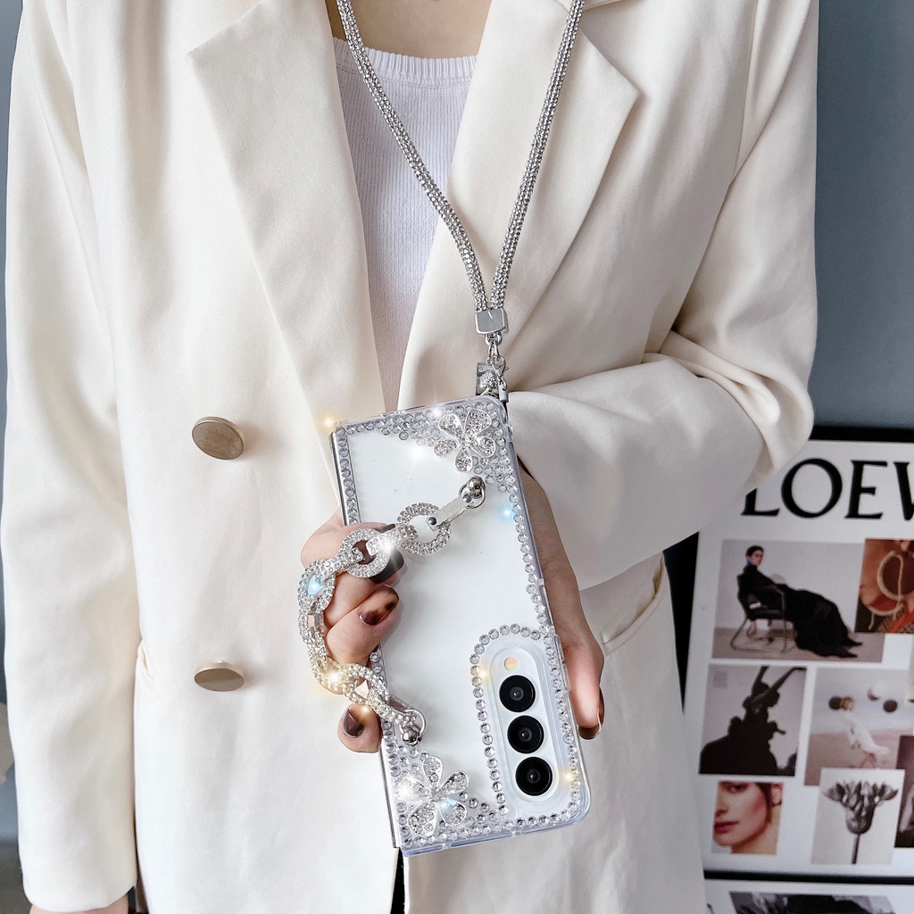 Aesthetic Flip Casing Samsung Z Fold4 Z Fold3 With Chain Shiny Transparent for Samsung Galaxy Z Fold 4 Z Fold 3 With Lace Phone Case