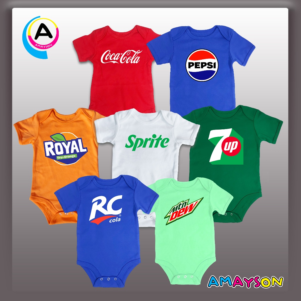 Amayson Soft Drinks theme baby onesie (Coca Cola, 7up, Mountain Dew, RC Cola, Pepsi, Royal, Sprite)