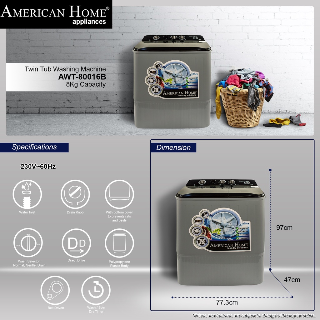 American Home AWT80016B 8kg Twin Tub Washing Machine