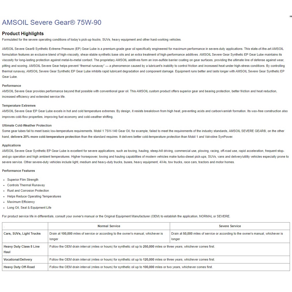 Amsoil SEVERE GEAR 75w-90 100% Synthetic Extreme Pressure (EP) Gear Lube Gear Oil