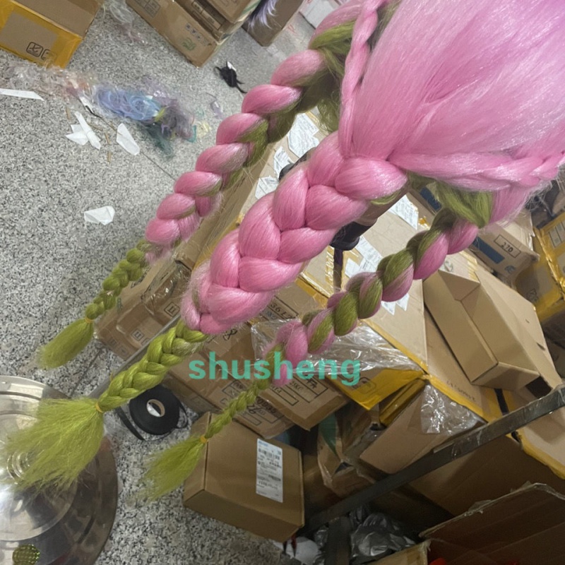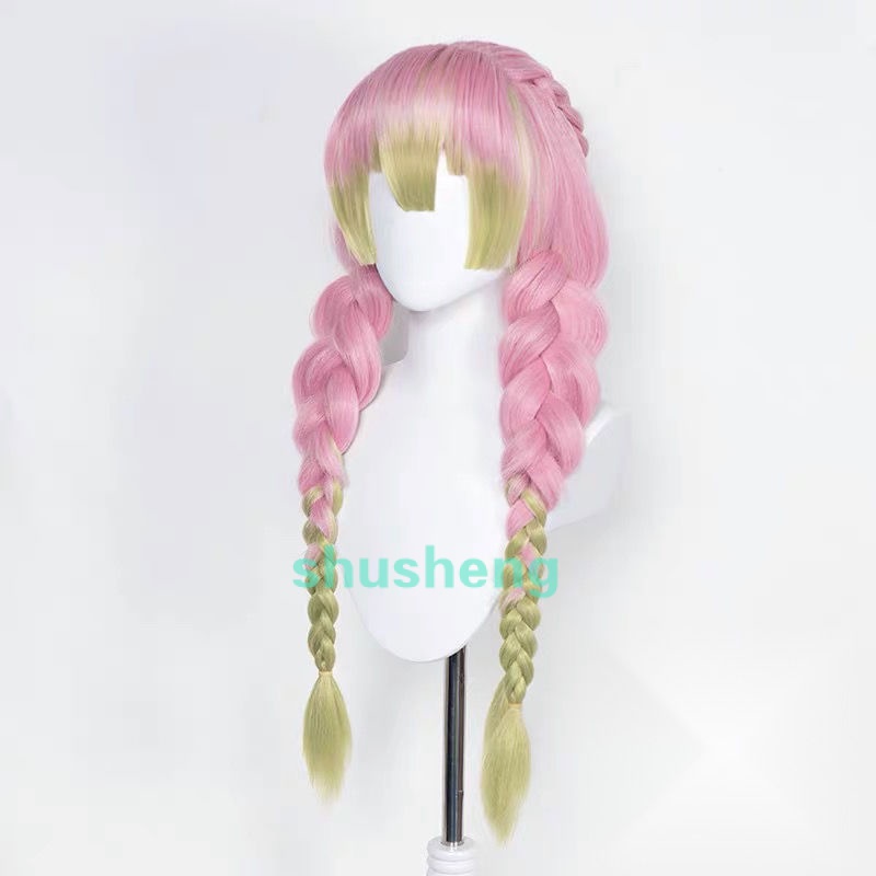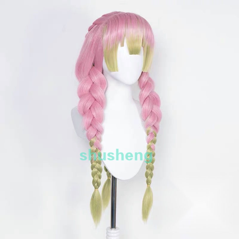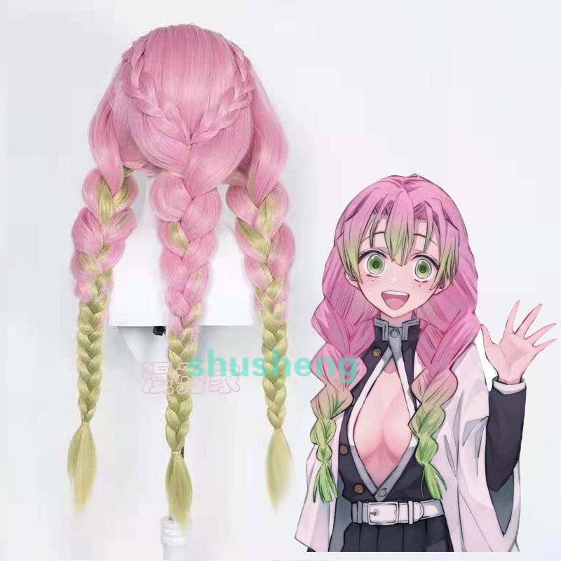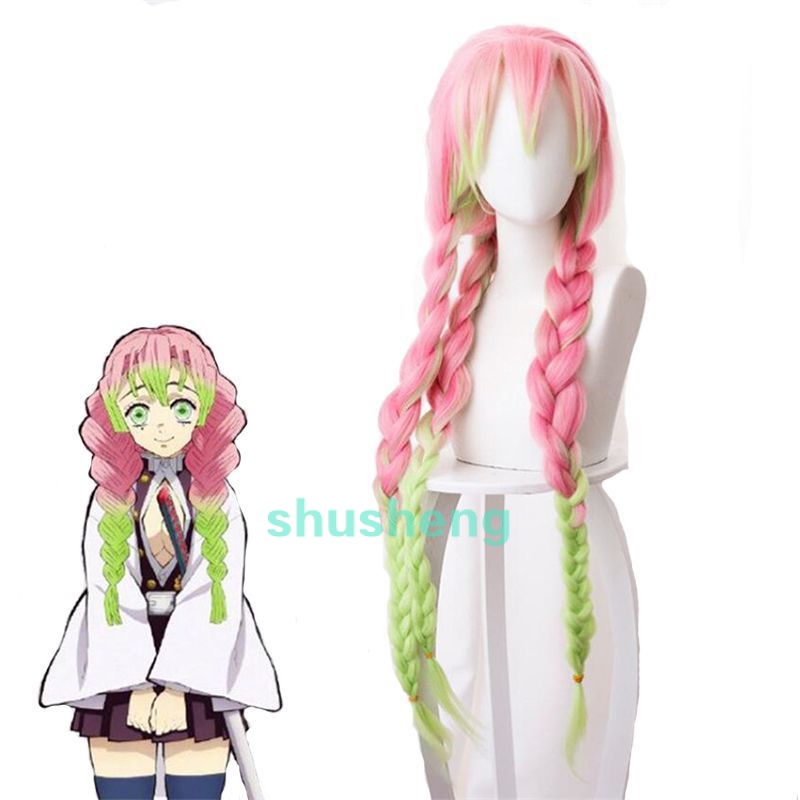 Anime Demon Slayer Kanroji Mitsuri Kimetsu No Yaiba 90cm Cosplay Wig Green Pink Colorful Braids Thick Hair