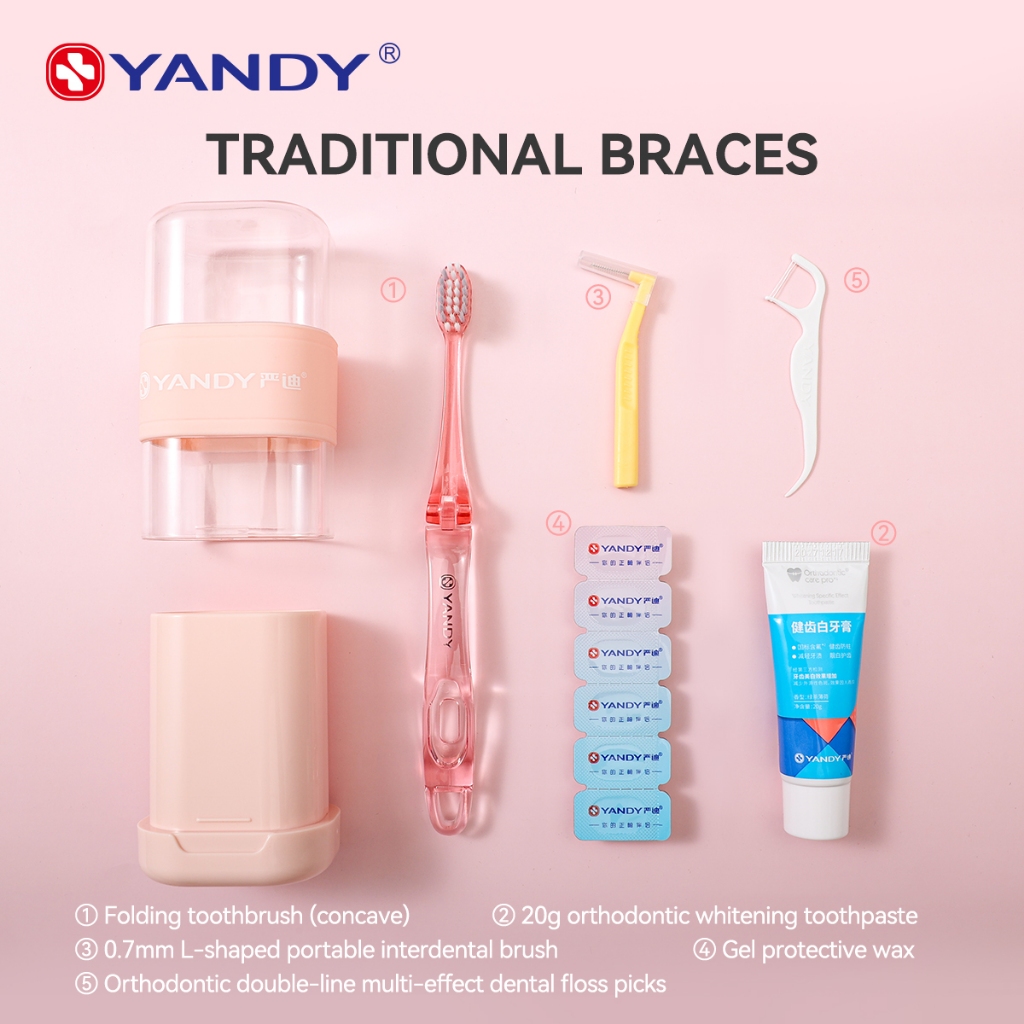 YANDY Orthodontic Care Kit - 6-Piece Set for Braces & Invisible Aligners with Toothbrush, Floss Picks, Dental Wax, Interdental Brush, Toothpaste & Portable Tools