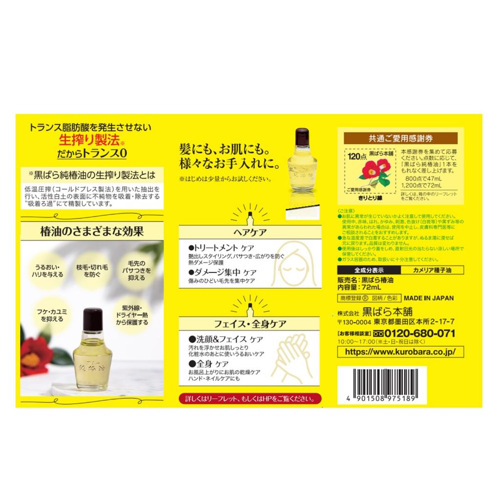 Direct from Japan | Kurobara Honpo Pure Kurobara Camellia Oil, 72ml, 100% Camellia Oil, Hair Oil, Multi-Purpose Oil, Leave-In Treatment, Fragrance-Free