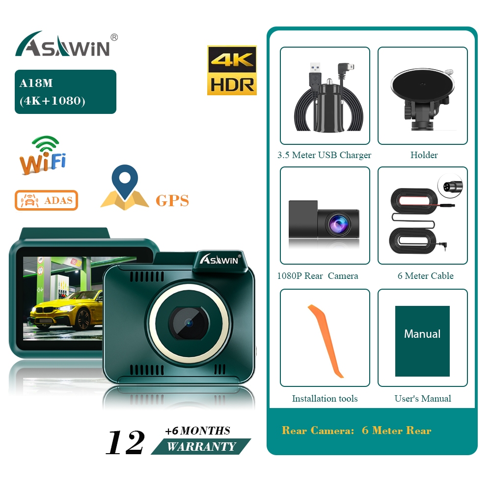 Asawin A18 4K ADAS Dash Cam Wifi Gps Front And Rear Car Camera 2.35" Touch Ips Screen Night Vision LDWS FCWS G-sensor Support 24H Park Mode
