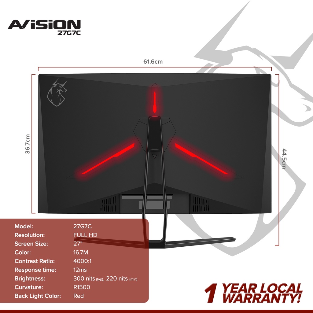 Avision 27inch 165Hz 1920x1080 16:9 (MPRT 1ms) Full HD Curved 1500R FreeSync Gaming Monitor 27G7C
