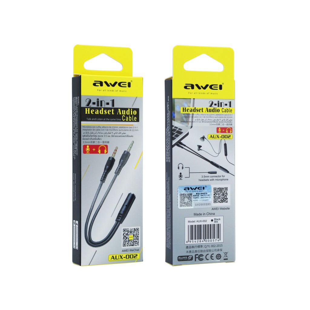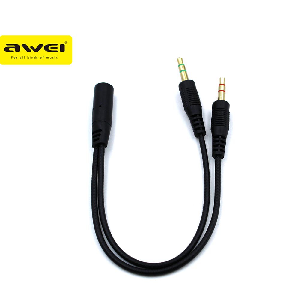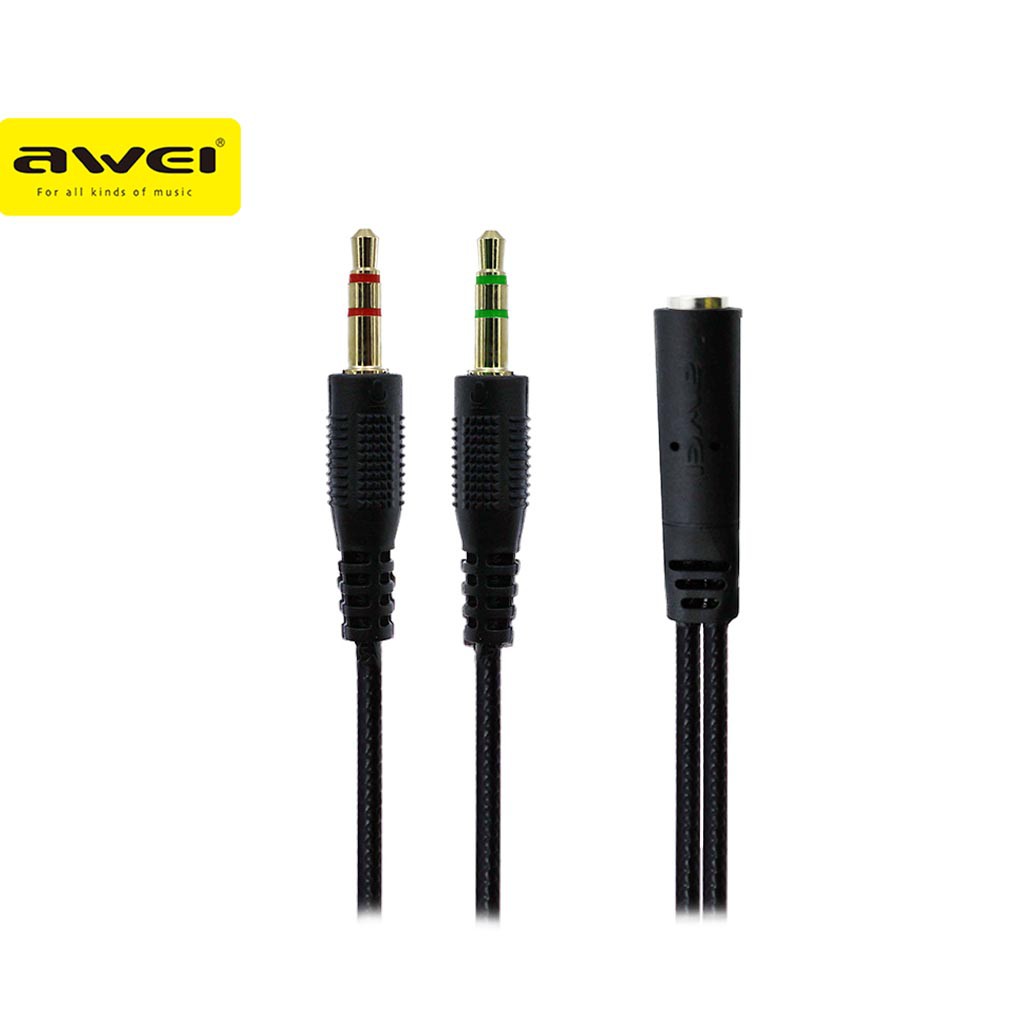 Awei AUX-002 Audio Splitter AUX Cord 3.5mm Headset Microphone 2 Male Jack 1 Female Port Cable
