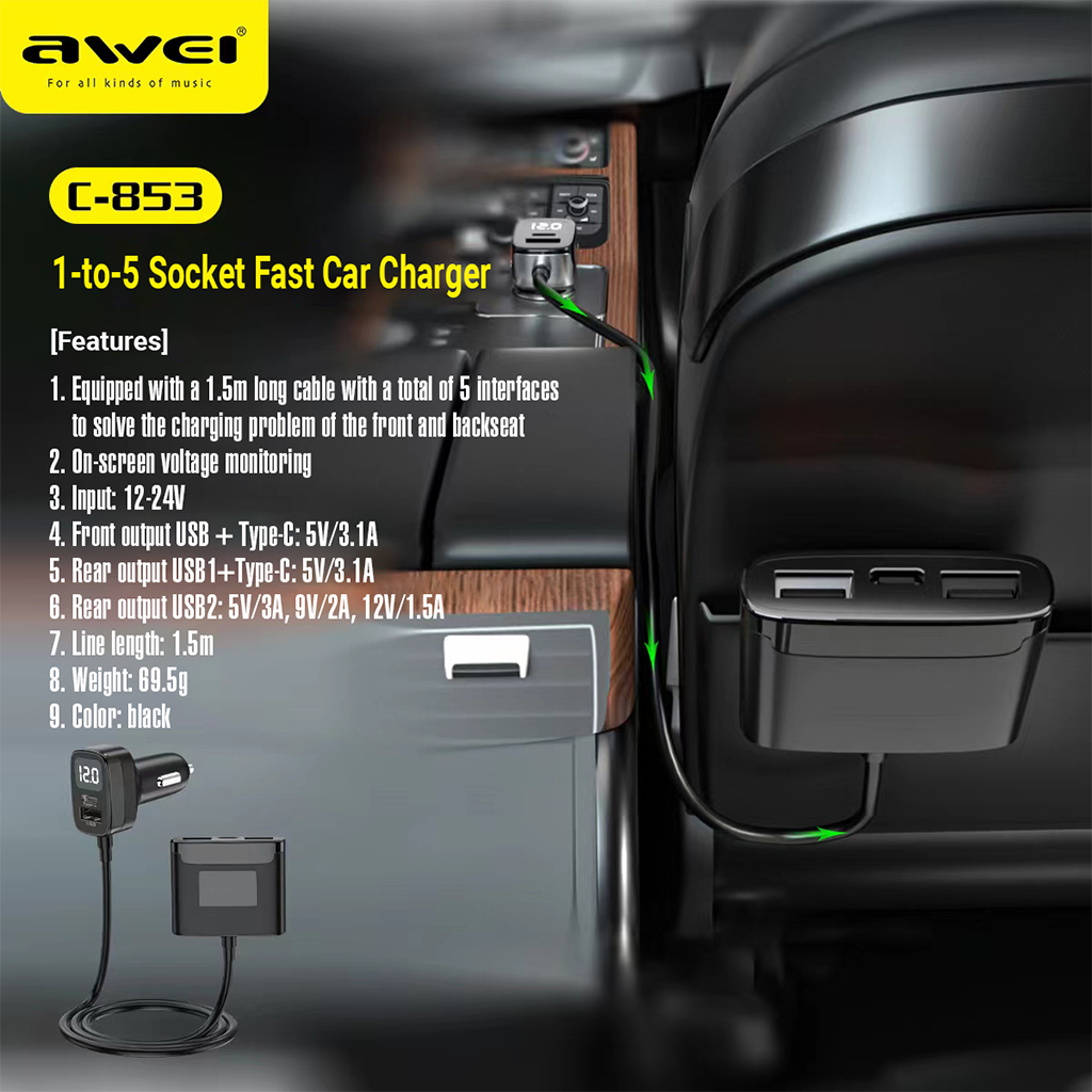 Awei C-853 1.5m Fast Charging 78W Car Charger 12-24V Quick Charge LED Indicator For Mobile Phone COD