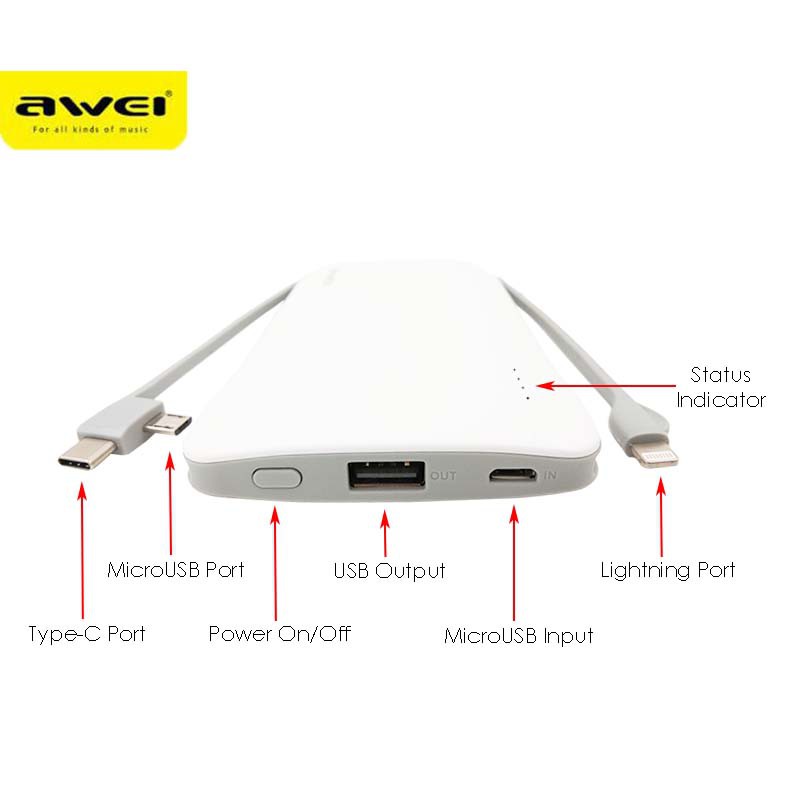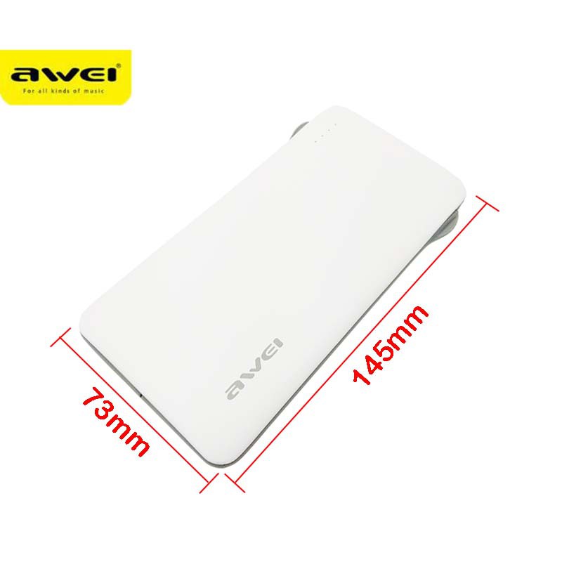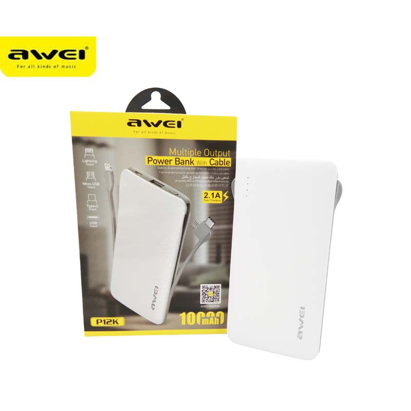 Awei P12K 10000mAh Multiple Output Portable Power Bank with Built-In Cable Fast Charging Powerbank