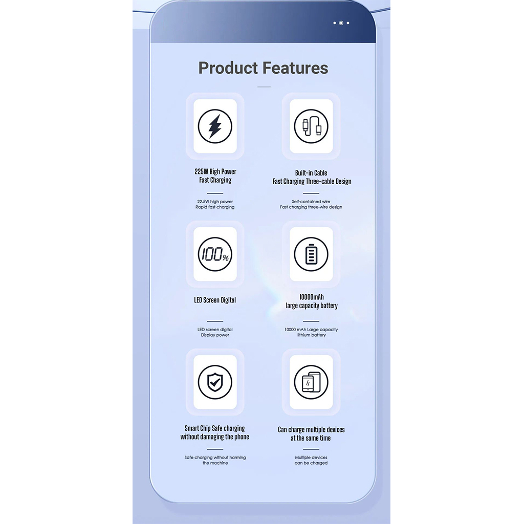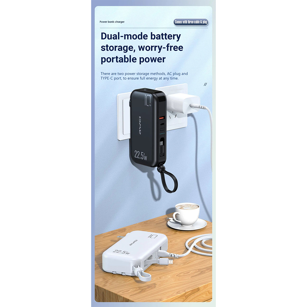 Awei P189K 10000mAh Portable Powerbank 22.5W Fast Charging With Built-In Cables Power Bank Charger