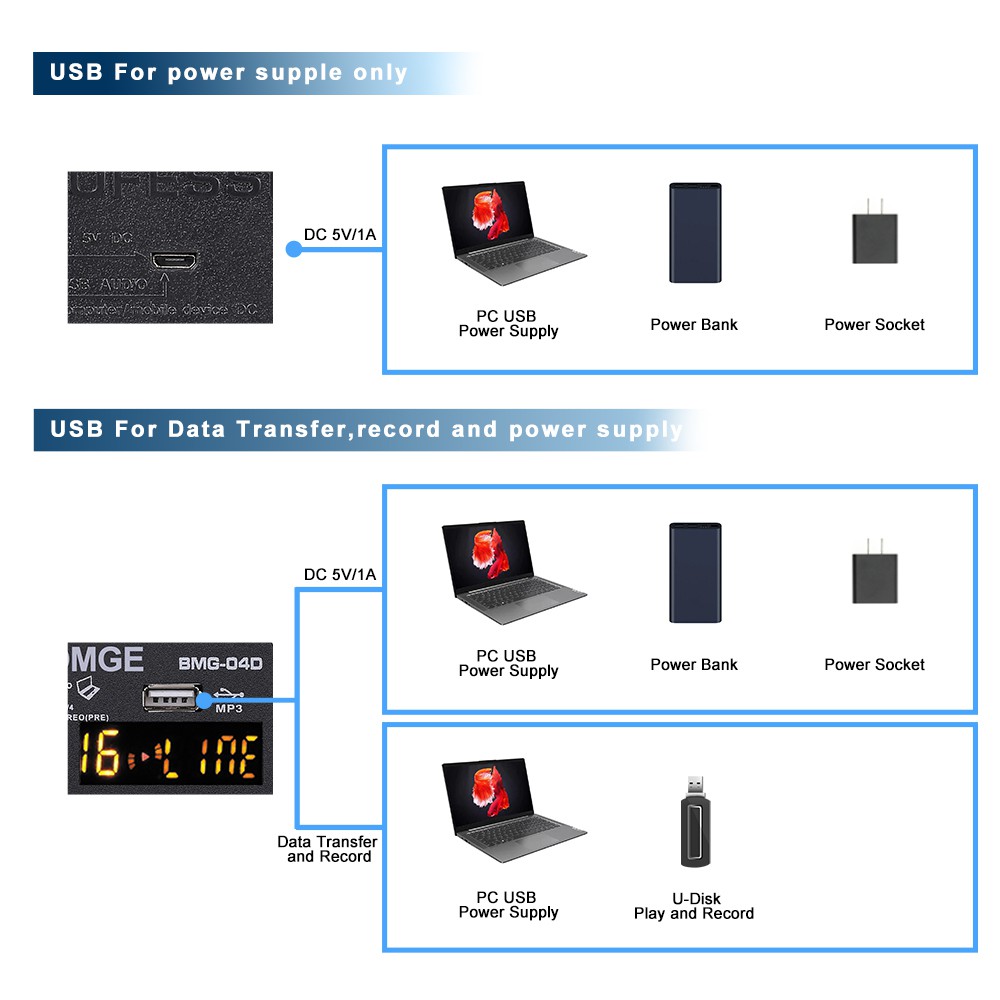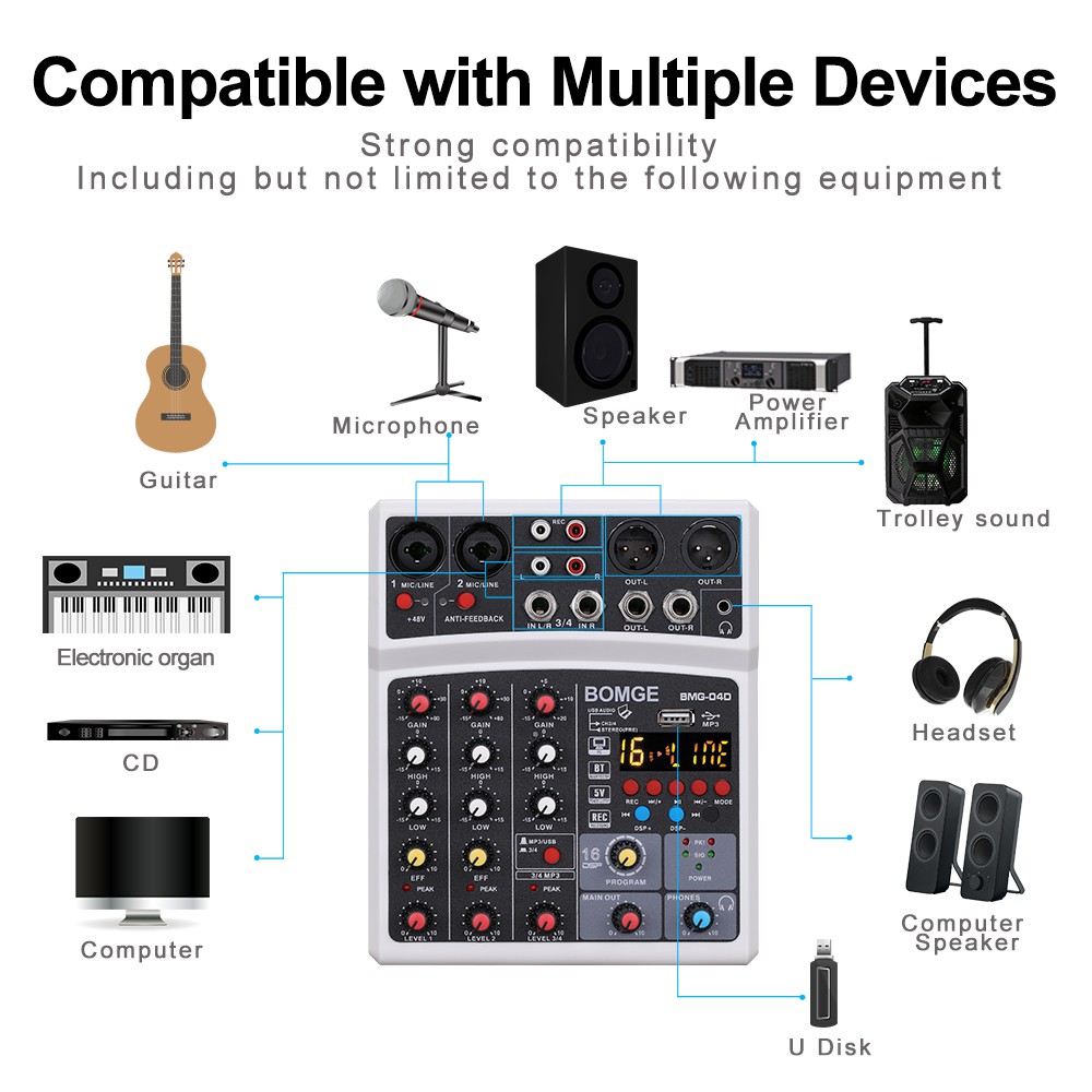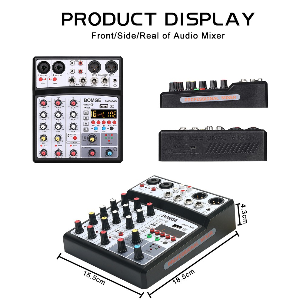 BOMGE 4 channel dj audio sound mixer with MP3 USB Bluetooth, stereo record,48V phantom power,5V power,16 DSP Echo Mixer