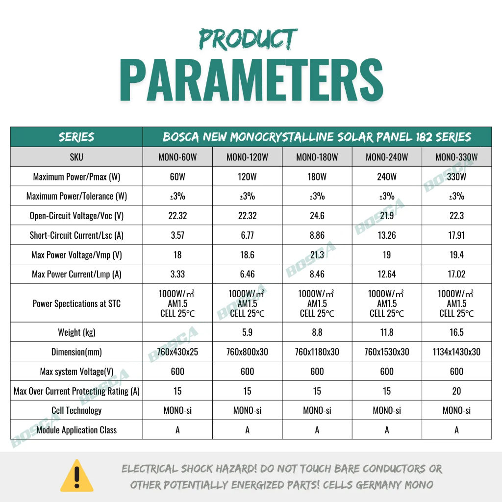 BOSCA 5 Year Warranty Monocrystalline Solar Panel MONO 240W 12V Solar module cell #182 Series COD