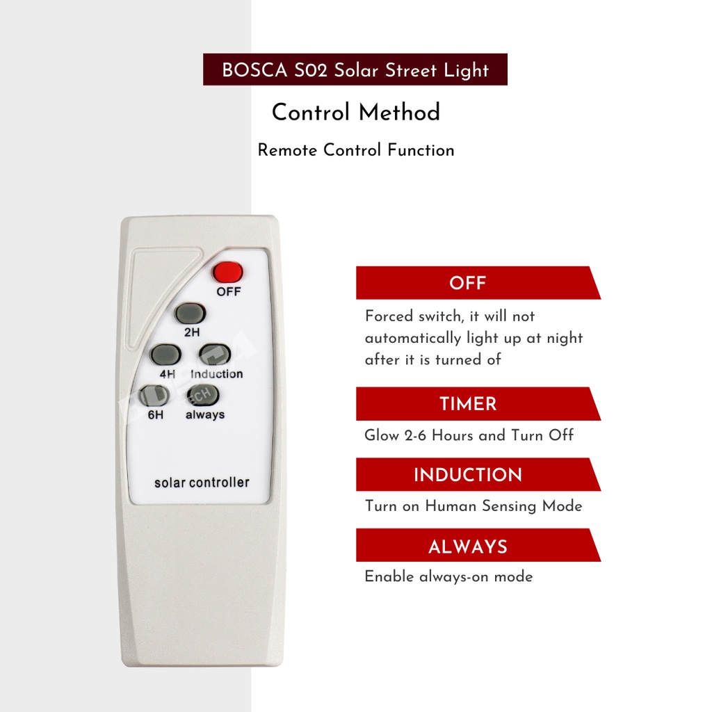 BOSCA Solar Street Light LED IP65 S02 120W Solar Panel 16w Remote control Light control Time switch