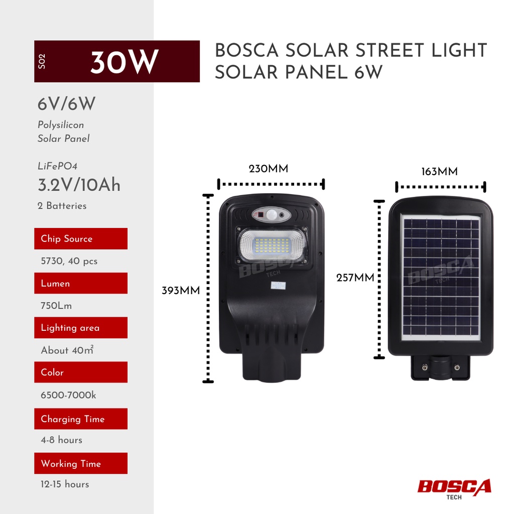BOSCA Solar Street Light LED IP65 S02 30W Solar Panel 6w Remote control Light control Time switch