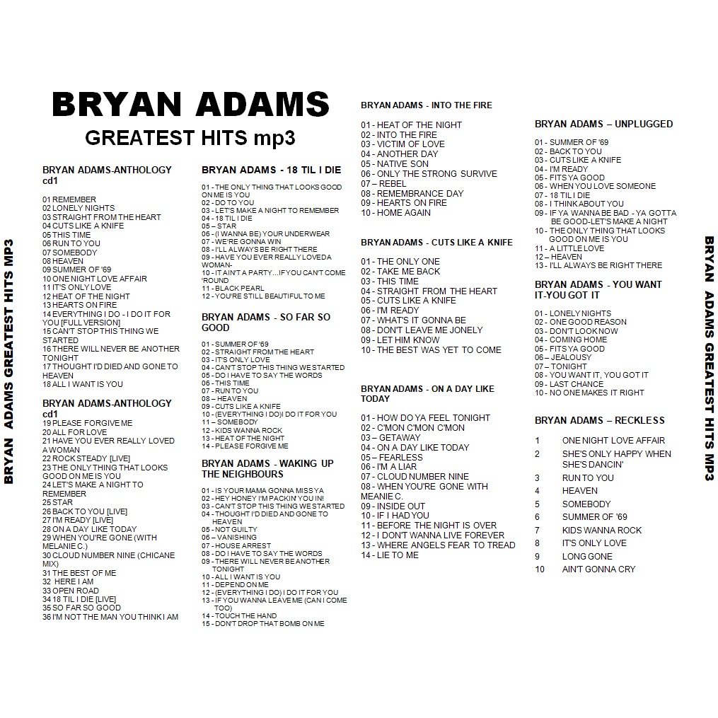 BRYAN ADAMS MP3 music CD for PC CDROM and compatibles
