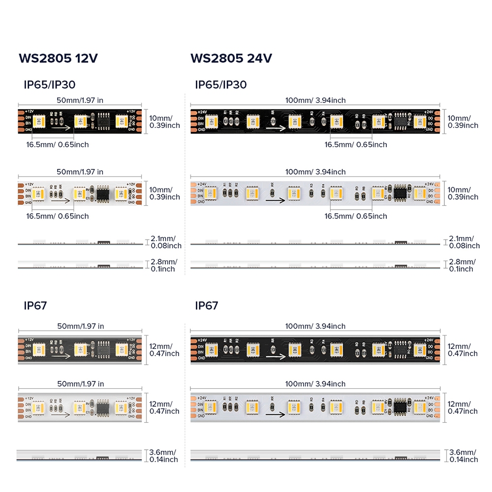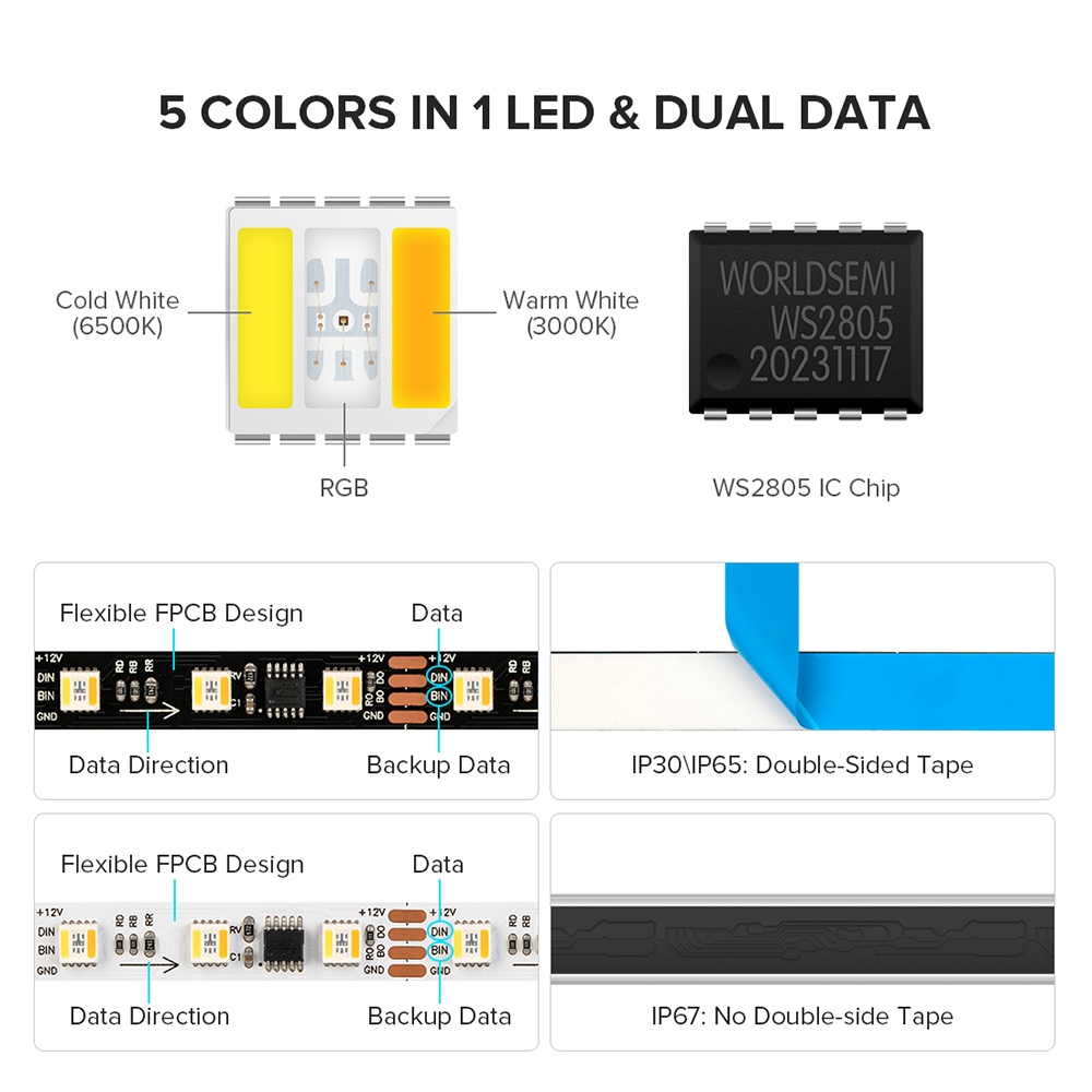 BTF-LIGHTING WS2805 RGBCCT IC 5-in-1 LED Strip DC 24V 60LEDs/m LED Pixels Strip Light Addressable.