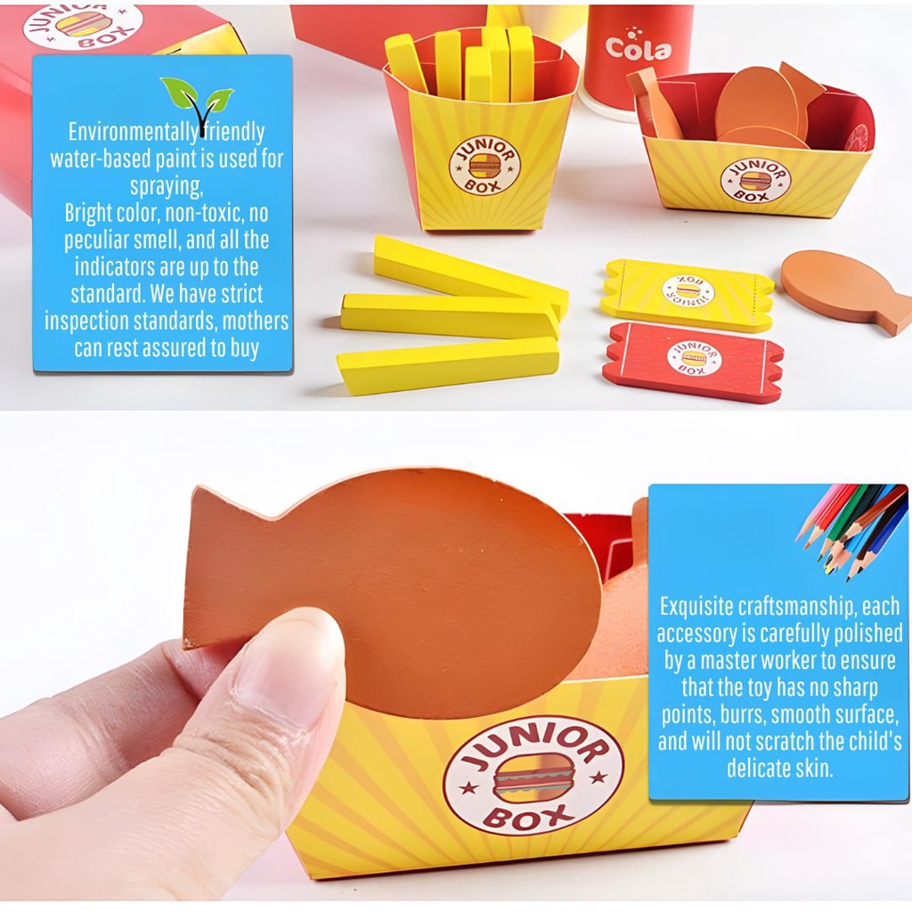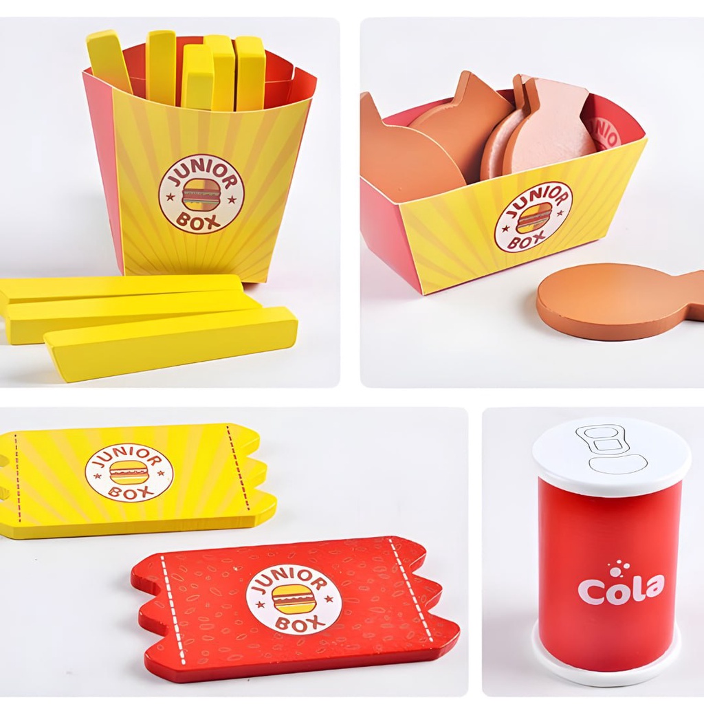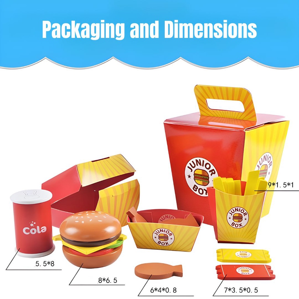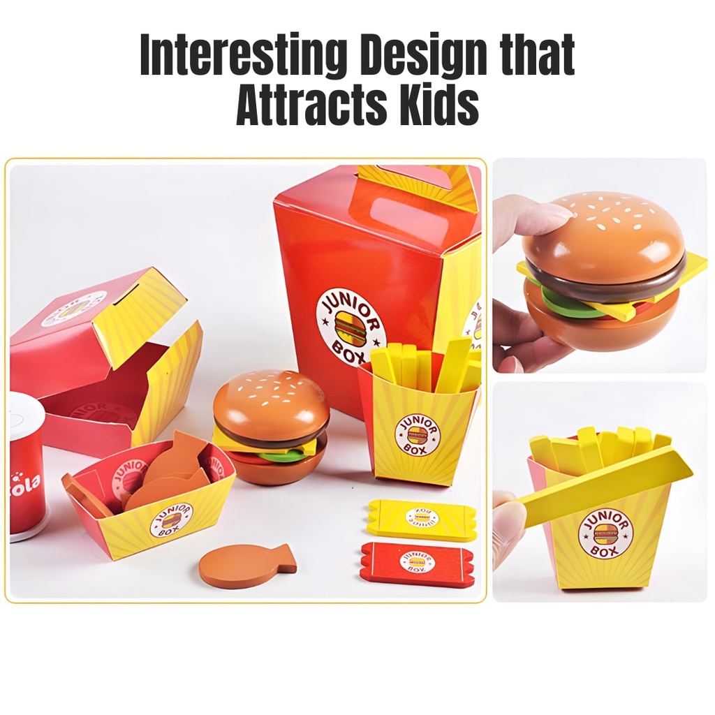 BYJ Wooden Diner Fast Food Burger Set with Real Take Out Box for Kids Pretend Play